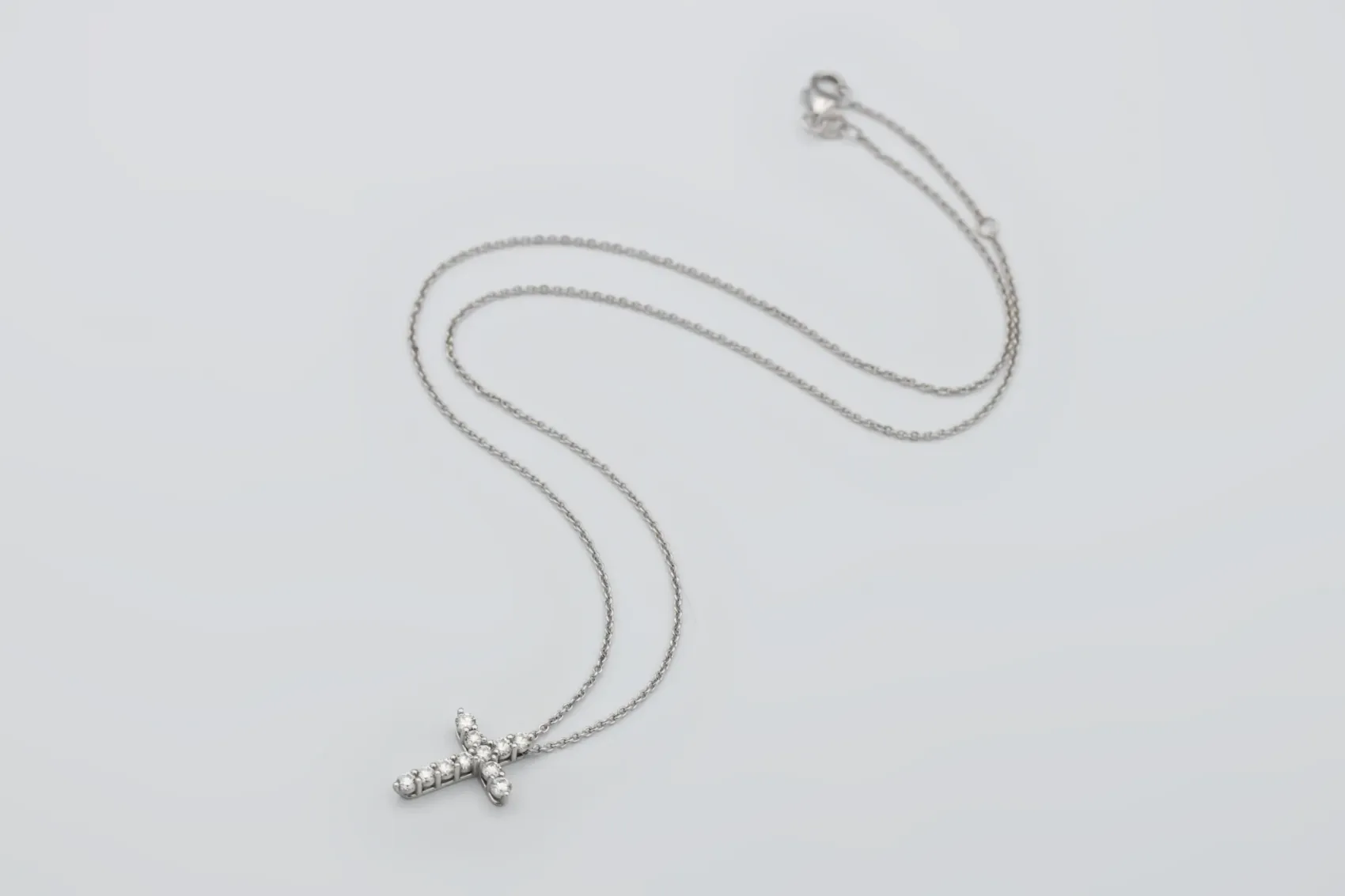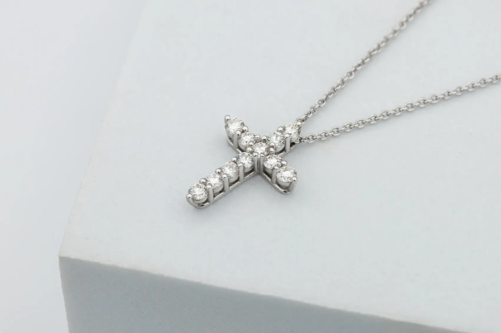This elegant 18ct white gold cross pendant necklace combines timeless design with refined sparkle. Set with 0.51 carats of brilliant-cut natural diamonds, graded E colour and VS clarity, the pendant radiates exceptional brightness and purity. Each diamond is perfectly matched and meticulously set, creating a graceful, symmetrical cross that captures light beautifully from every angle.