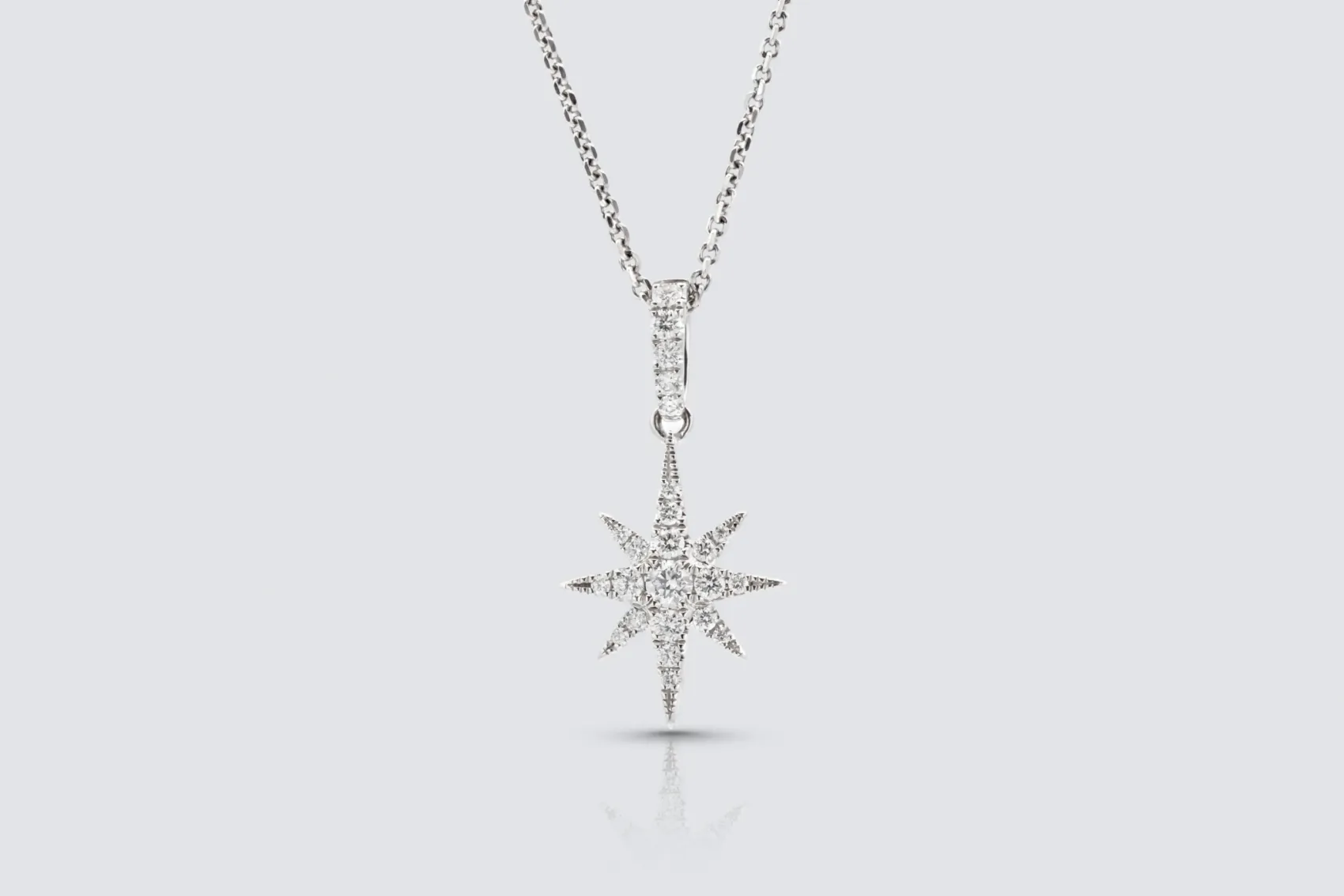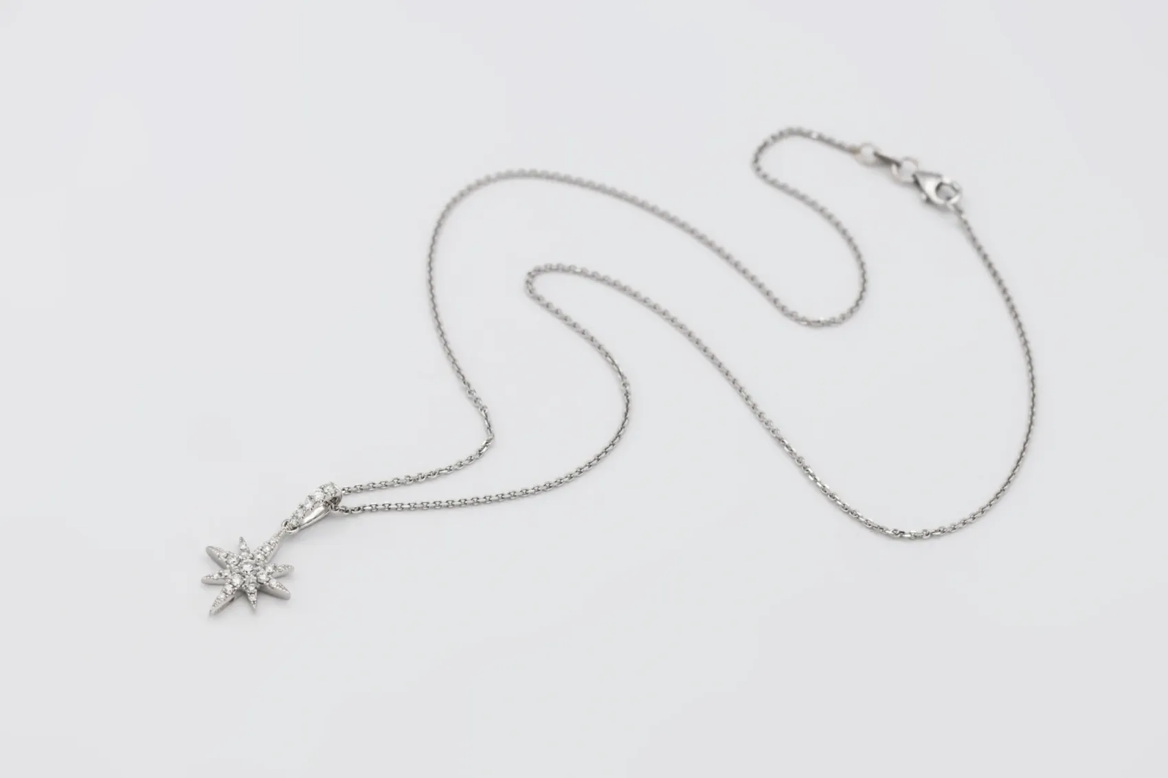 The diamond is set in a refined star-shaped 18ct white gold pendant, designed to reflect light gracefully with each movement. Suspended from a delicate white gold chain, this necklace is the perfect touch of timeless luxury for both everyday wear and special occasions.