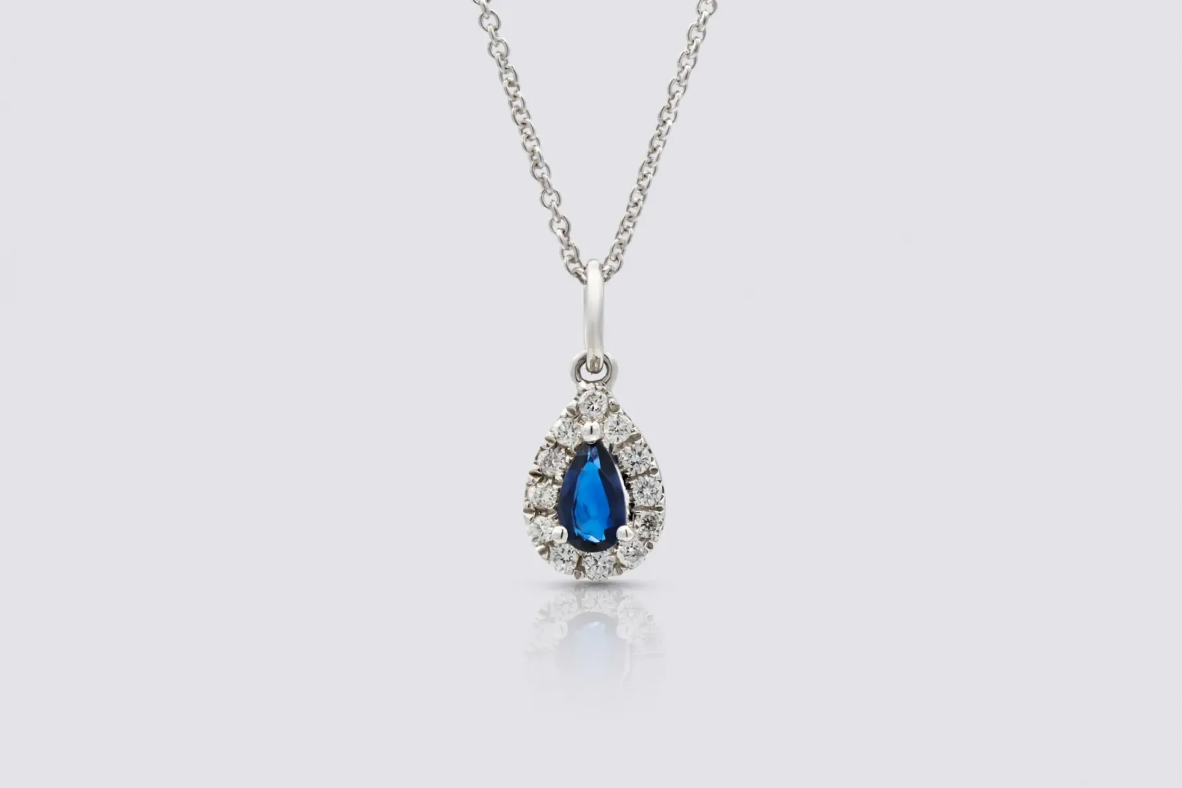 This elegant 18ct white gold pendant necklace showcases a beautifully cut natural pear-shaped sapphire, its rich blue hue radiating sophistication and timeless appeal. The sapphire is complemented by natural brilliant-cut diamonds, delicately set to enhance the gemstone’s depth and brilliance.