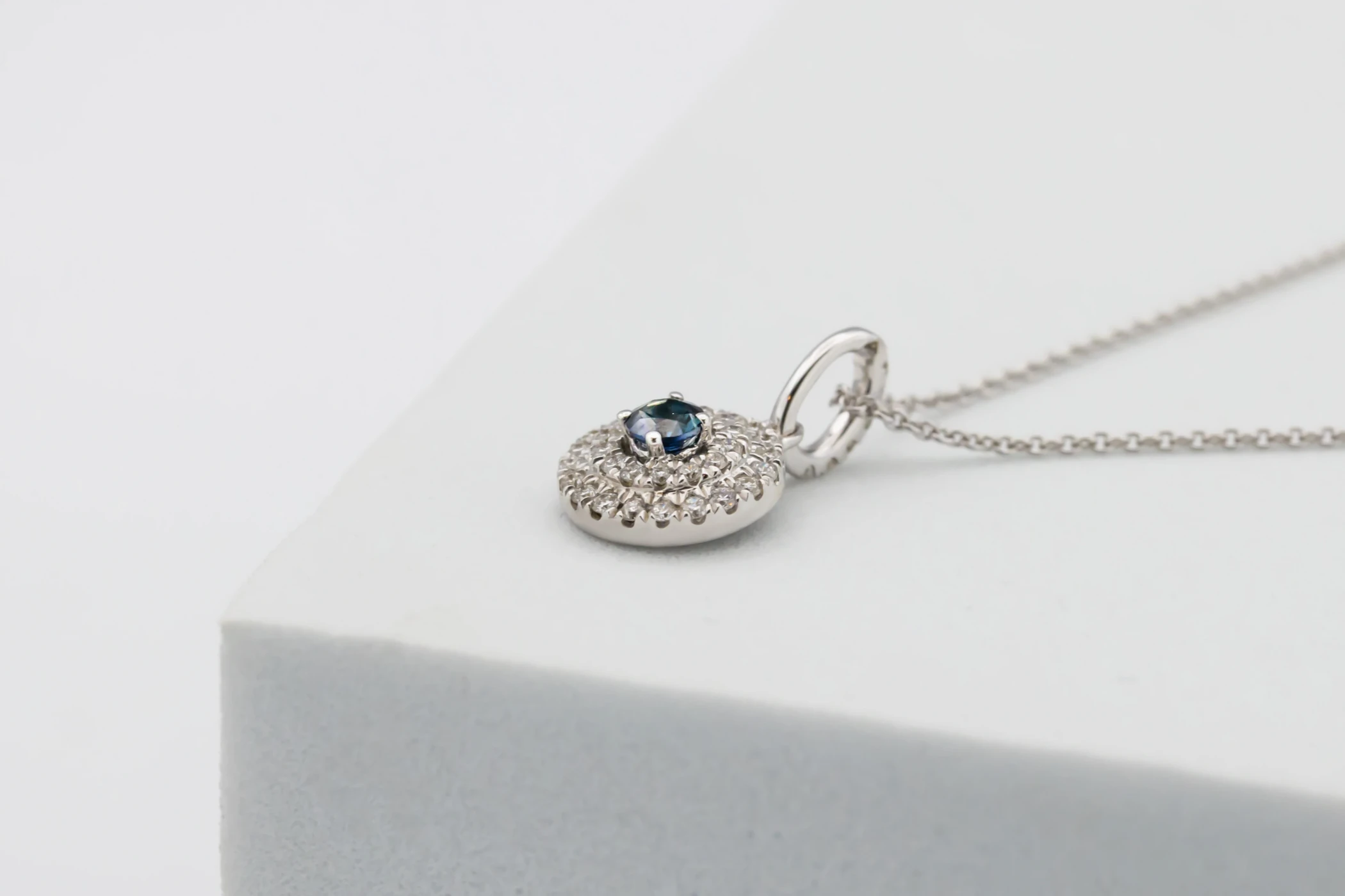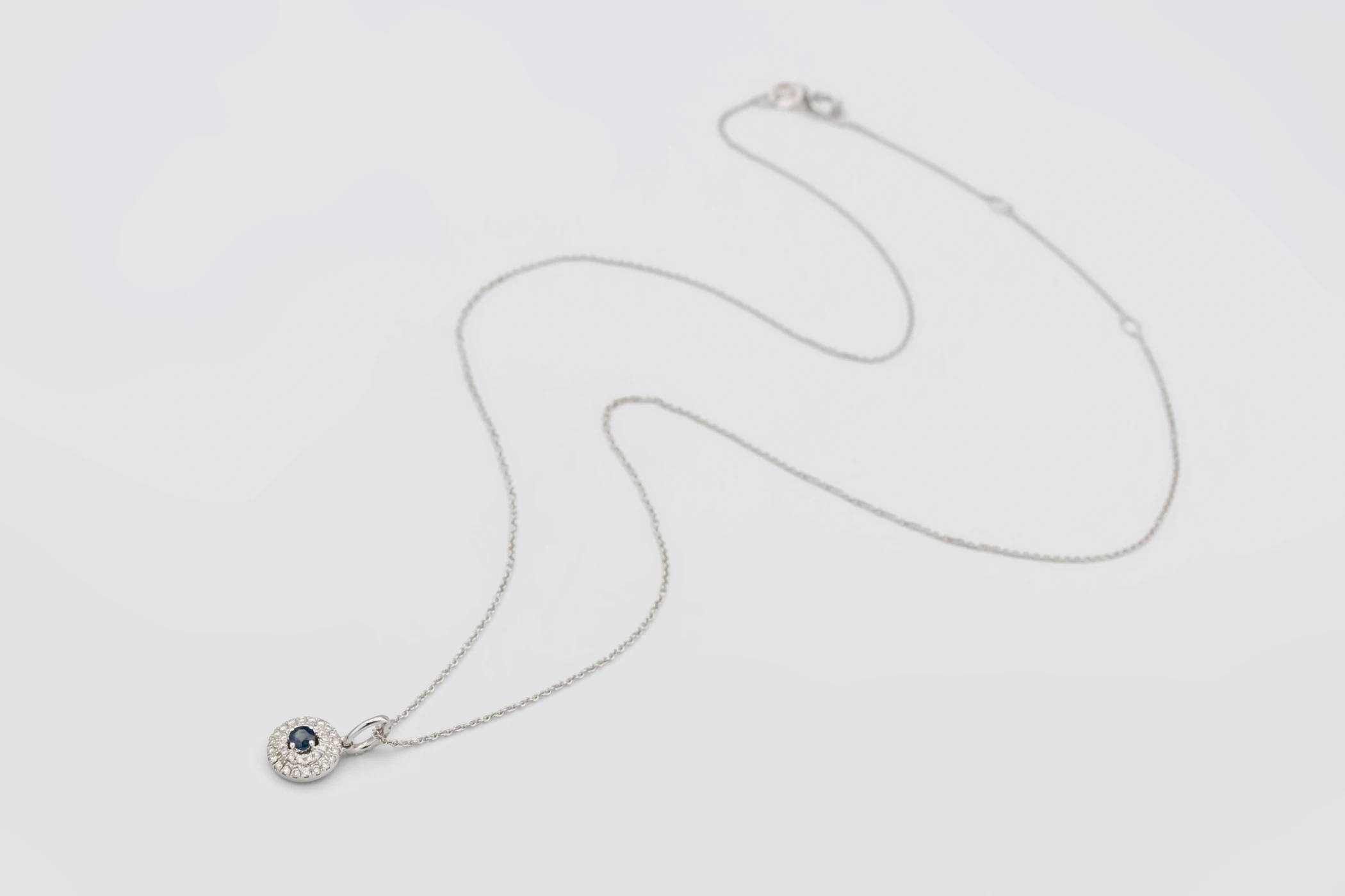 This elegant 18ct white gold sapphire and diamond pendant necklace captures timeless beauty and refined sophistication. The design features a natural round-cut sapphire, its deep blue hue beautifully complemented by brilliant-cut diamonds in a classic prong setting that enhances the stones’ sparkle and fire.