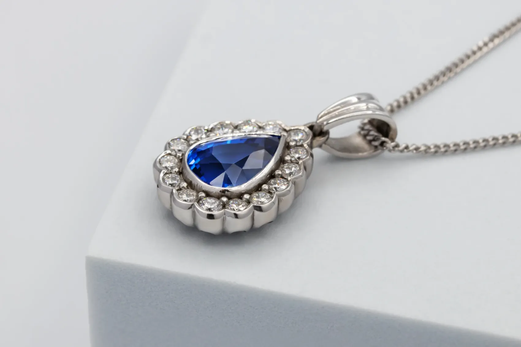 This exquisite 18ct white gold sapphire and diamond necklace is a true showcase of elegance and craftsmanship. The centrepiece features a stunning 4.76-carat pear-cut sapphire, displaying a deep, velvety blue hue with remarkable brilliance. Surrounding the sapphire is a halo of 1.00 carat of diamonds, graded G colour and VS clarity, adding a brilliant contrast and amplifying the pendant’s radiance.