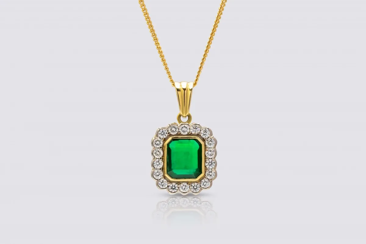 This striking necklace is crafted in 18ct yellow gold and showcases a vivid 4.12ct emerald as its centrepiece. The emerald’s rich green hue is beautifully complemented by 1.08ct of sparkling diamonds that surround the gemstone in a bold and elegant design. The pendant measures 17mm x 20mm (30mm including the bale) and weighs 12.4 grams, giving it a luxurious presence while remaining refined and wearable. A statement piece of fine craftsmanship, this necklace is perfect for special occasions or as an heirloom jewel to be cherished for generations.