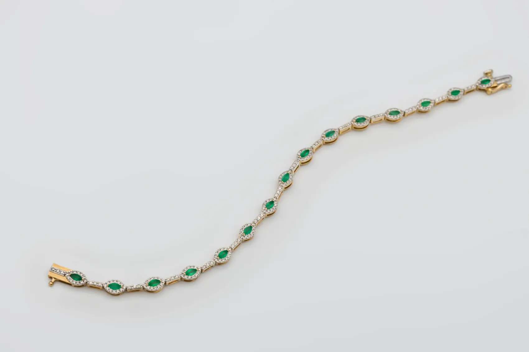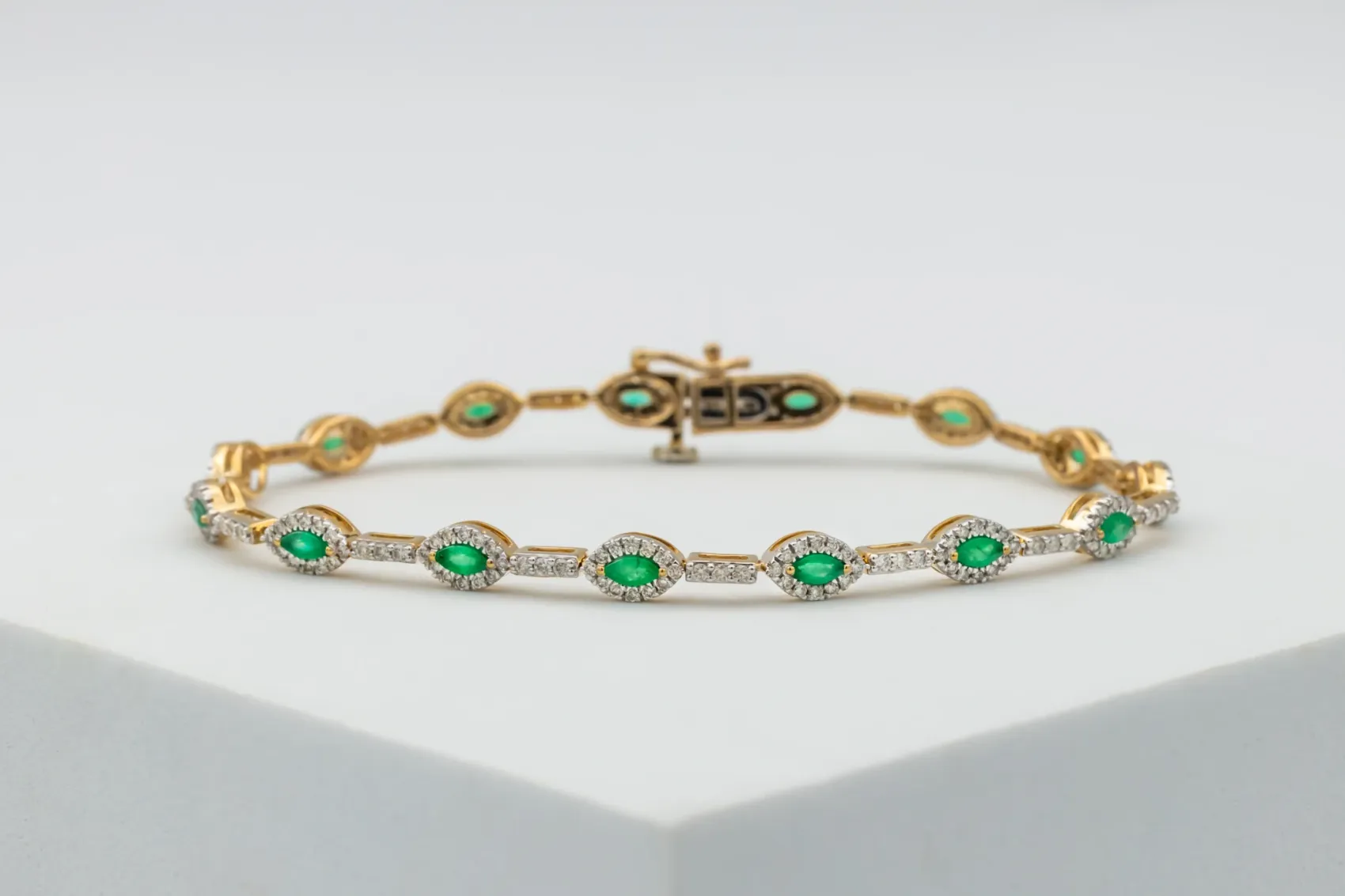 This elegant 9ct yellow gold emerald and diamond bracelet combines timeless charm with refined craftsmanship. The design features beautifully matched emeralds of vibrant green colour, complemented by 1.40 carats of natural brilliant-cut diamonds that add a captivating sparkle. The combination of rich yellow gold, vivid emeralds, and shimmering diamonds creates a luxurious and sophisticated aesthetic.