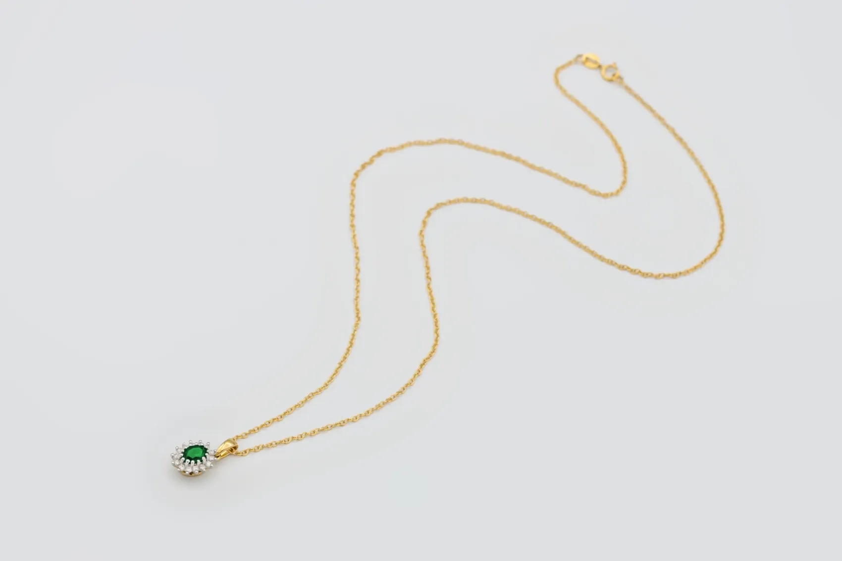 This elegant 9ct yellow gold necklace features a beautiful oval-cut emerald measuring 6x4mm, enhanced by a delicate surround of sparkling natural diamonds. The rich green hue of the emerald contrasts perfectly with the brilliance of the diamonds, creating a timeless and graceful pendant design.