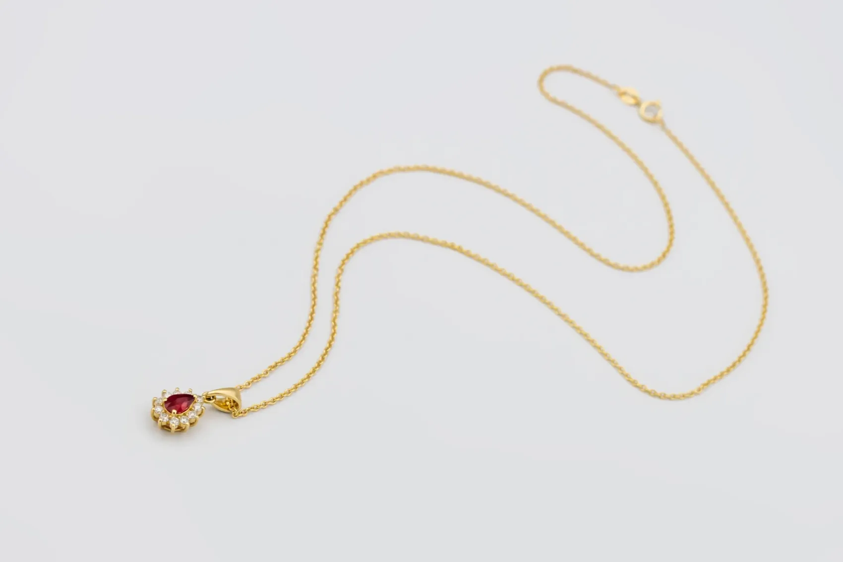 Suspended from a delicate 16-inch 9ct yellow gold chain, the pendant offers a graceful and versatile design — perfect for both everyday wear and formal occasions. The combination of ruby and diamond creates a classic and luxurious look, embodying understated sophistication.