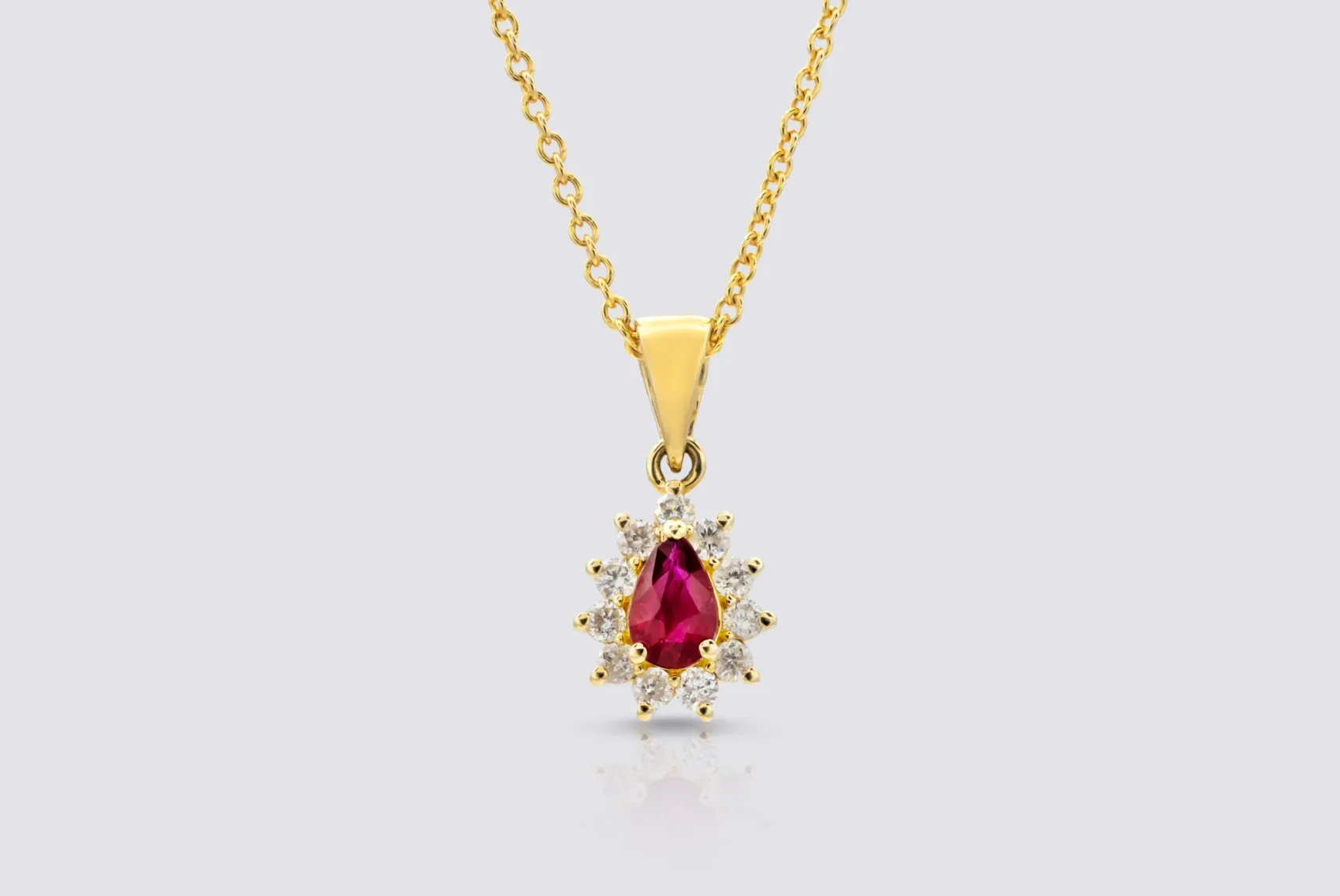 This elegant 9ct yellow gold pendant necklace showcases a beautifully cut natural pear-shaped ruby, its deep red tones symbolising passion and timeless elegance. The ruby is complemented by 0.28 carats of natural brilliant-cut diamonds, adding a refined sparkle that enhances the gemstone’s vibrant hue.