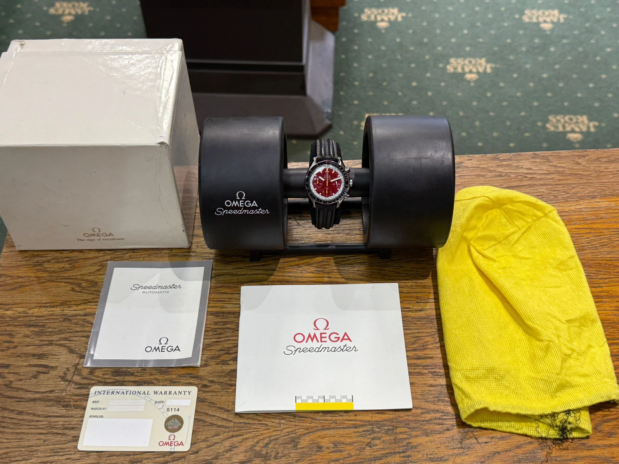 This example retains its original Omega strap and buckle and is presented as a complete collector’s set, including its original box, papers, booklets, and the distinctive Formula 1 wheel display stand — a rare and sought-after feature among enthusiasts. The watch is in superb condition throughout, combining the classic Speedmaster design with motorsport heritage and genuine collector appeal.