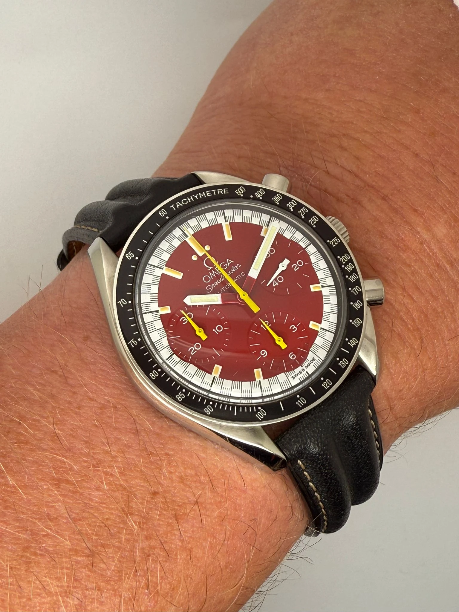 This 1999 Omega Speedmaster Automatic ‘Schumacher Edition’, reference 175.0032, is a highly collectable model celebrating Omega’s partnership with Formula 1 legend Michael Schumacher. Housed in a 39mm stainless steel case, it is powered by the calibre 1141 automatic chronograph movement — fully serviced and offered with a two-year guarantee for precision and reliability.