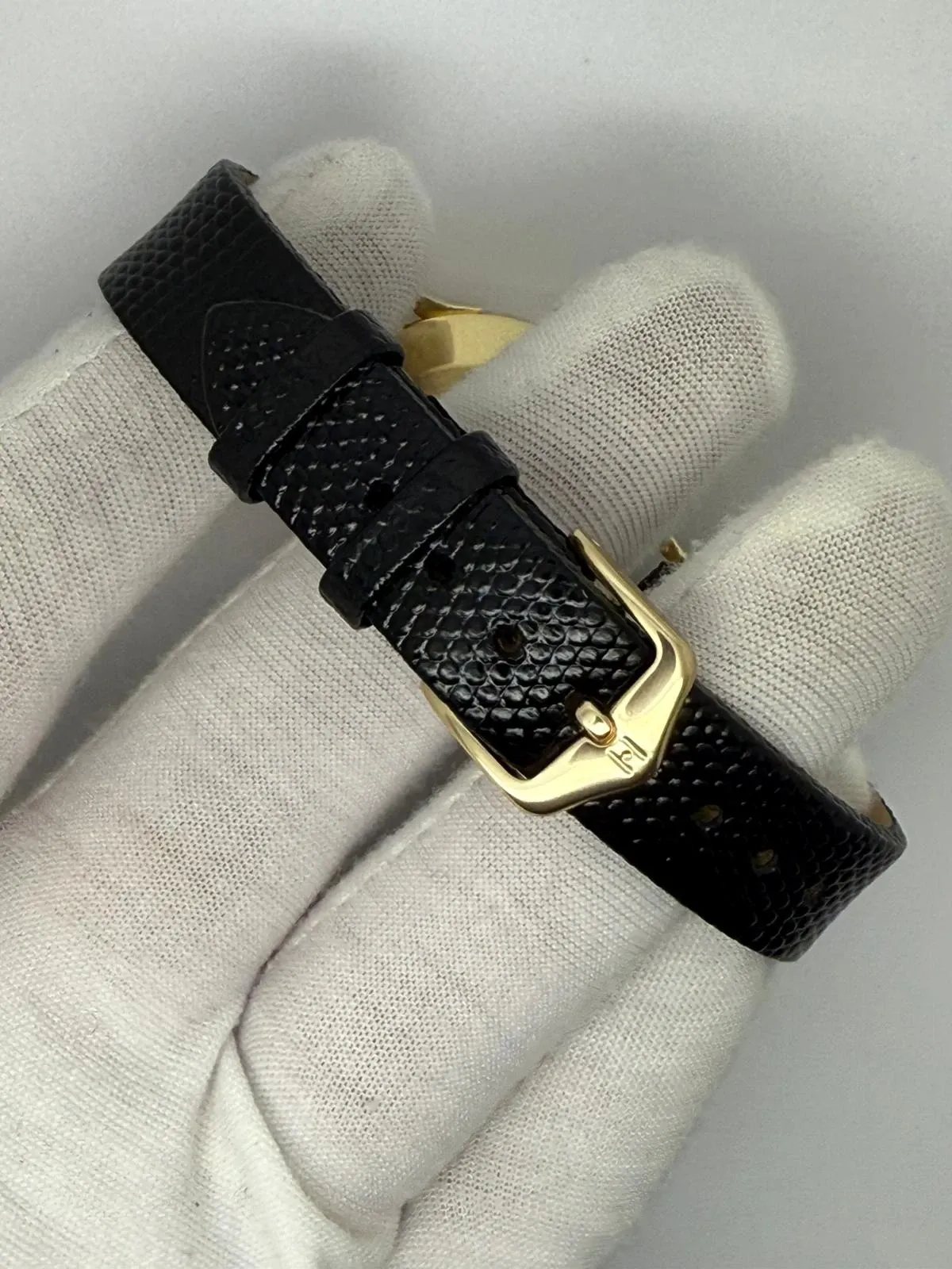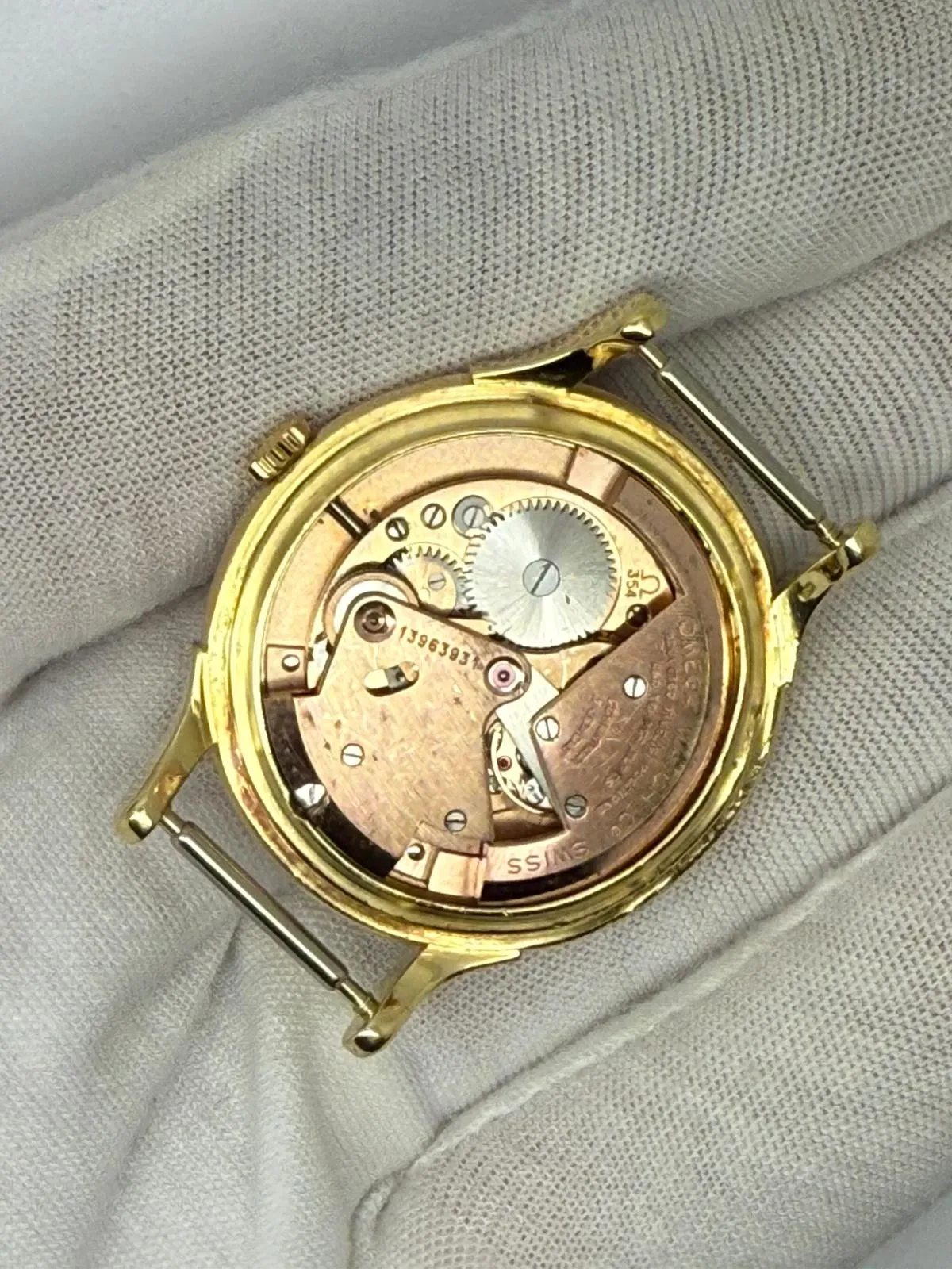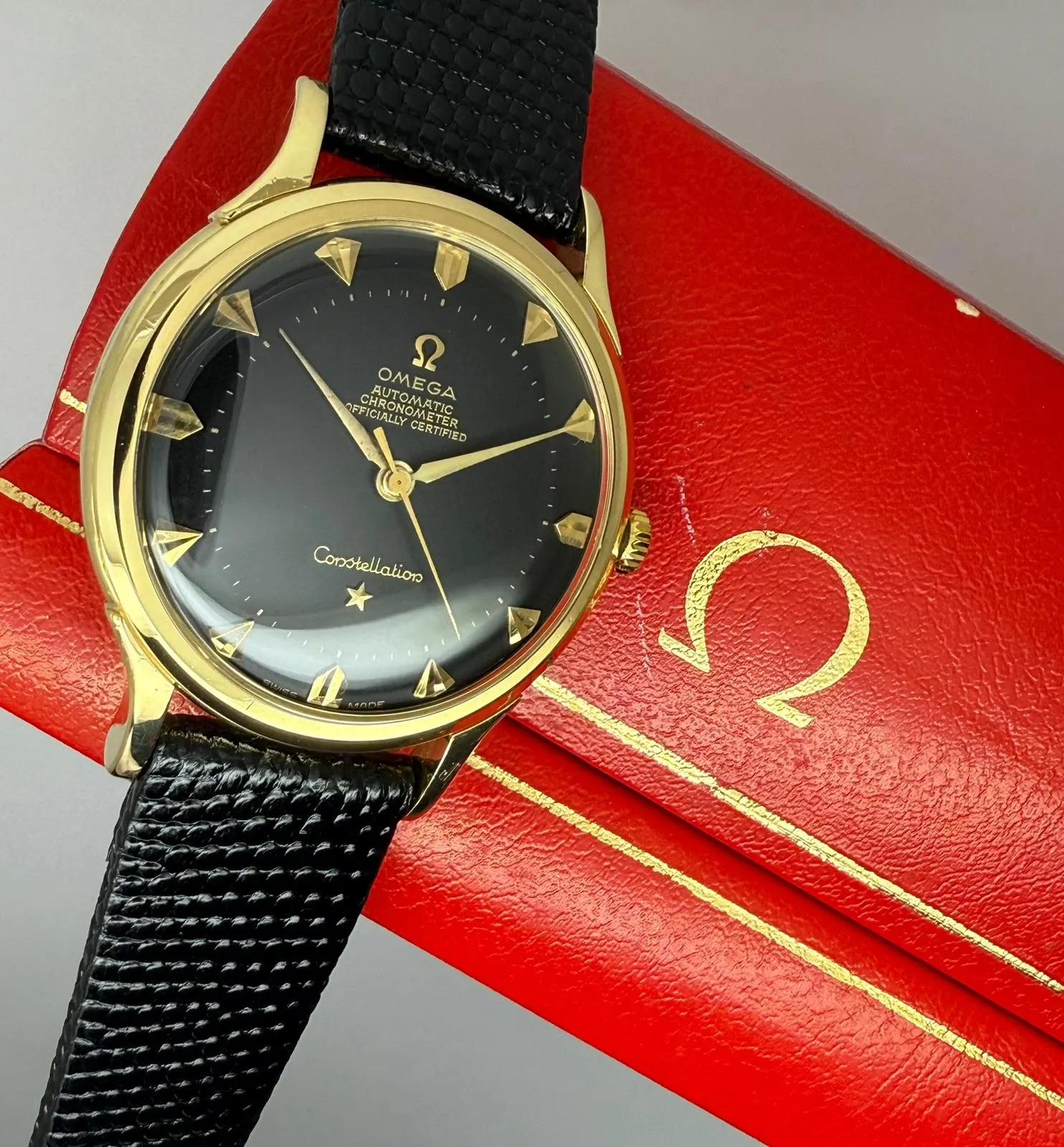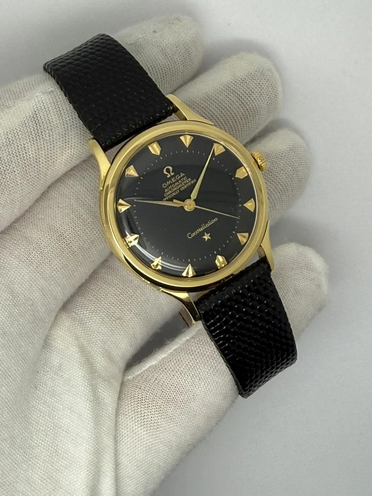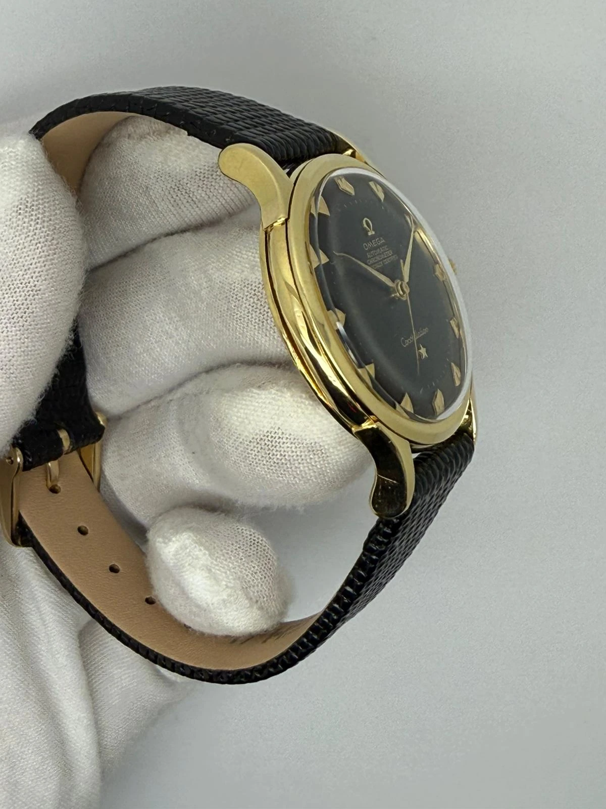 This 1952 Omega Constellation De Luxe, reference 2700SC, is a superb and rare example of one of Omega’s most celebrated chronometer watches. Crafted in solid 18ct yellow gold, the 33.5mm case houses a striking black pie pan dial, beautifully detailed with arrowhead hour markers and dagger hands — an iconic combination that epitomises early Constellation design.