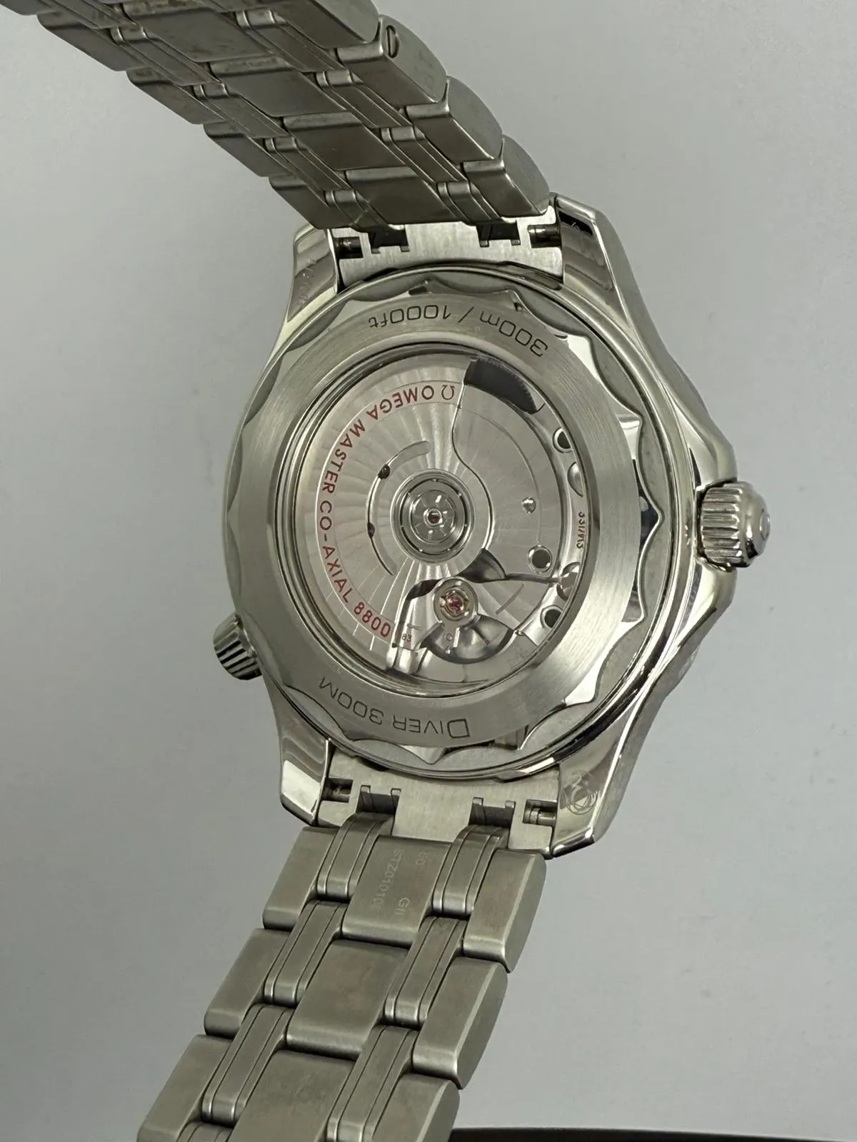Crafted from stainless steel, the 42mm case houses the Omega Co-Axial Master Chronometer Calibre 8800, officially certified for exceptional accuracy, magnetic resistance, and performance. The movement is visible through the sapphire exhibition caseback, while the screw-down crown, helium escape valve, and unidirectional bezel ensure professional-grade diving capability up to 300 metres.