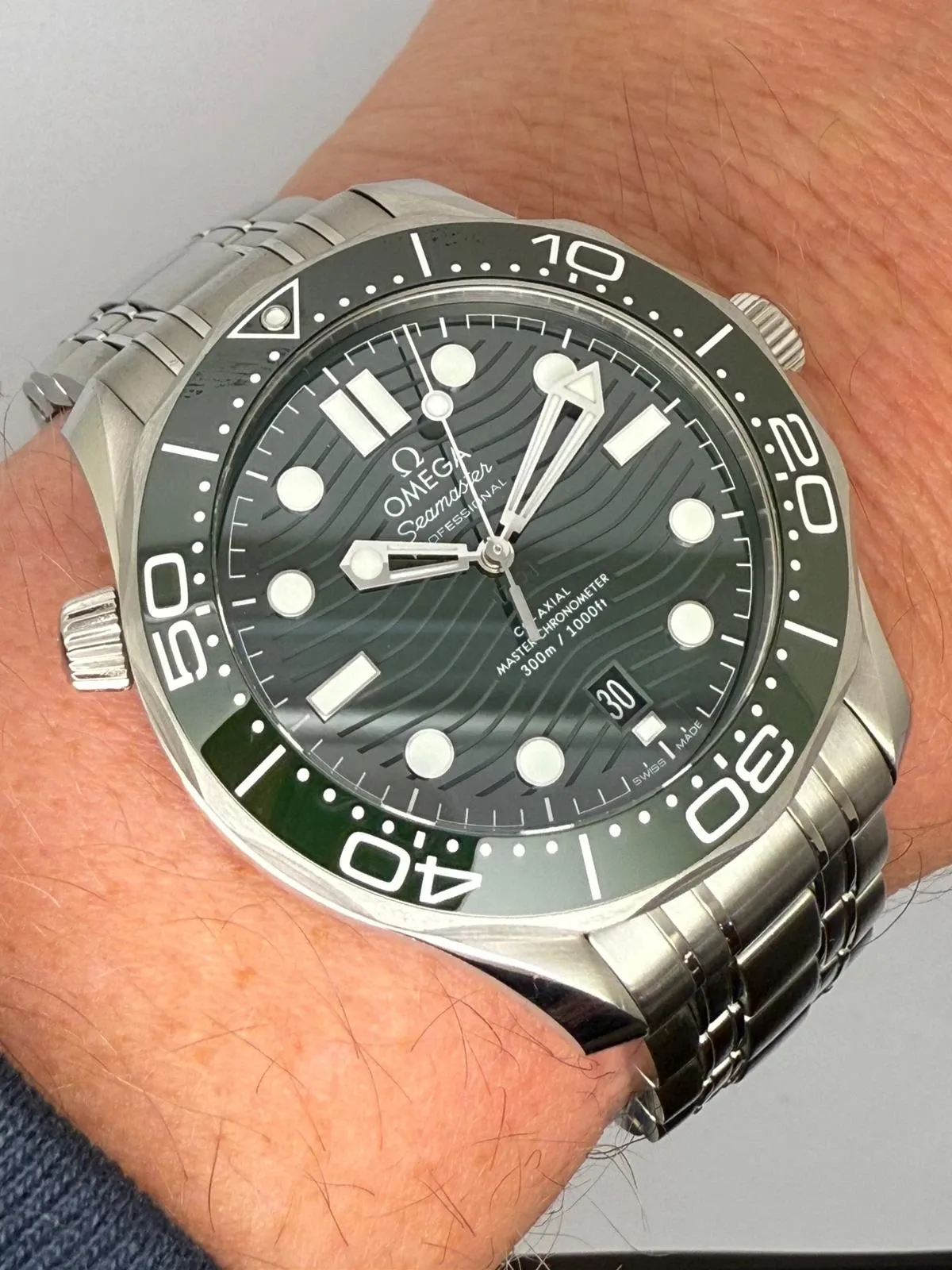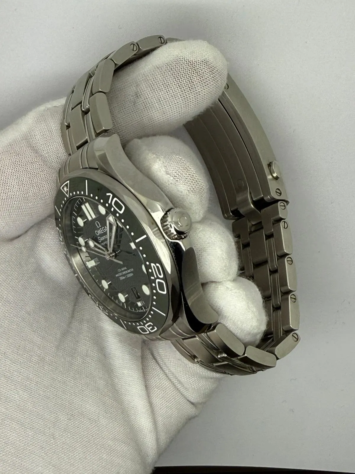 This 2025 Omega Seamaster Diver 300M, reference 210.30.42.20.10.001, is one of the most desirable modern Seamasters in production, featuring the highly sought-after green ceramic dial and matching bezel. The rich tone of the dial paired with the signature wave pattern gives this watch a bold yet refined appearance, true to Omega’s legacy of precision diving instruments.