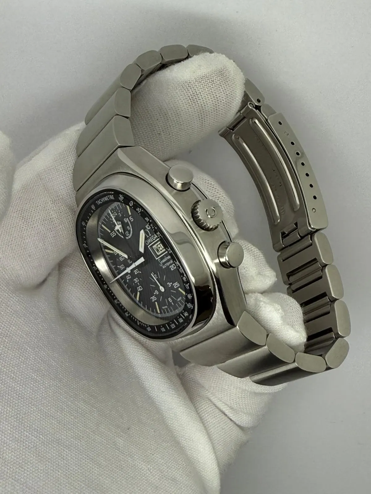 At its heart lies the Omega Calibre 1045 automatic chronograph movement, offering smooth functionality with day, date, and 24-hour indicators. The multi-register silver dial provides excellent legibility and a striking retro aesthetic, all protected by a robust mineral crystal.