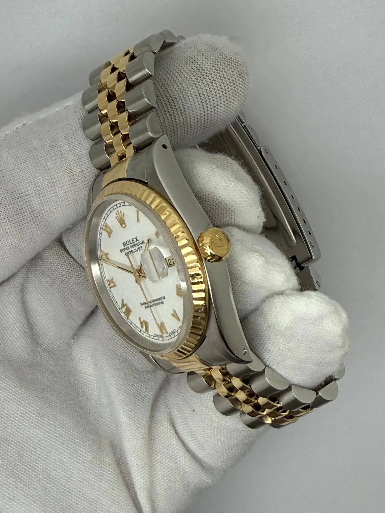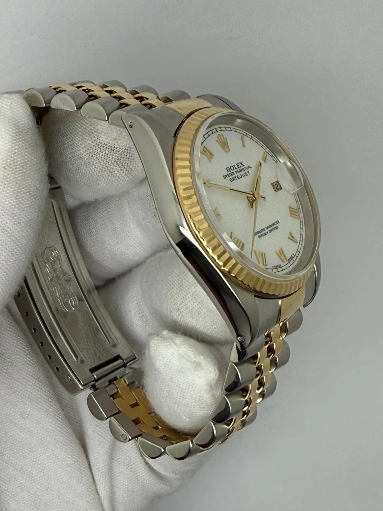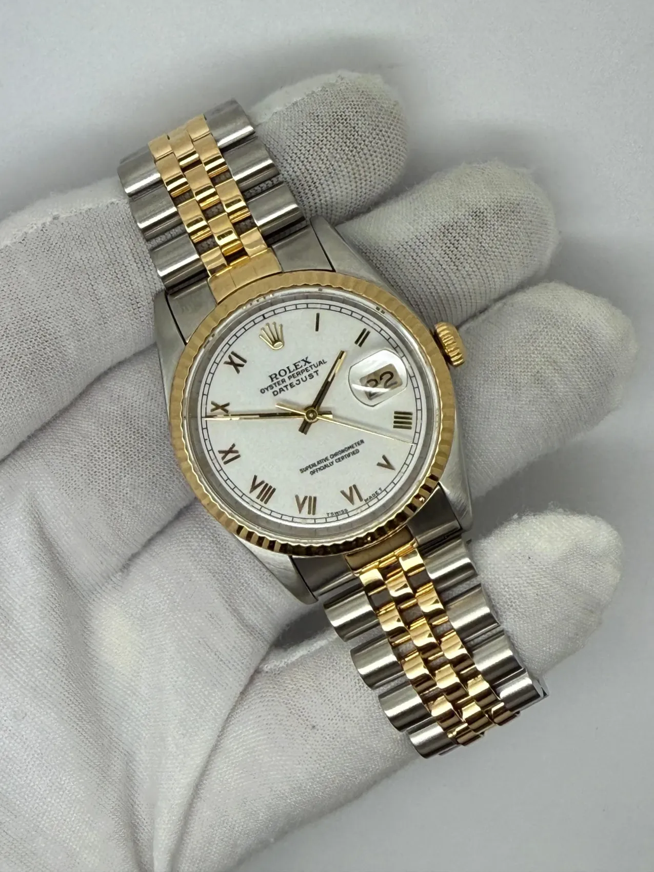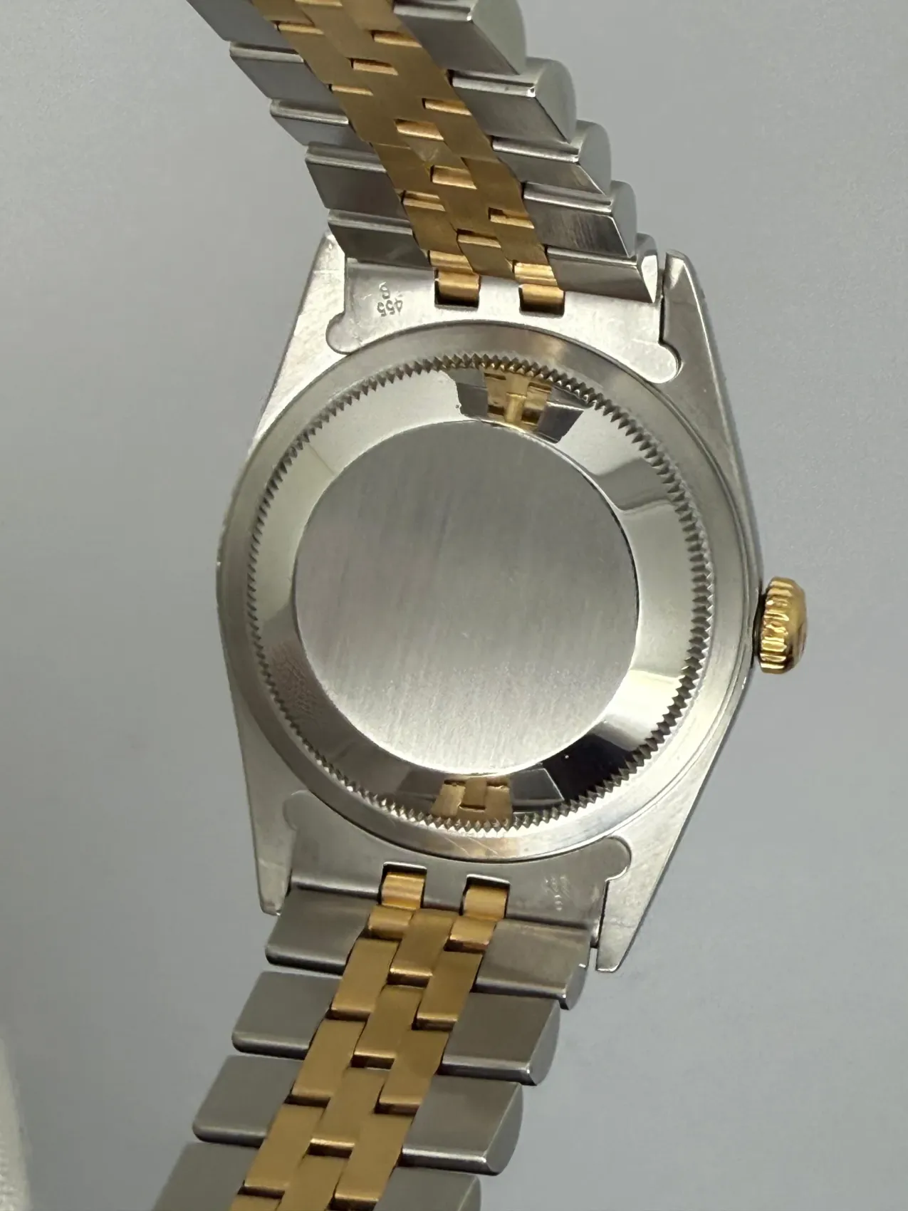 This 1993 Rolex Oyster Perpetual Datejust Ref. 16233 embodies timeless Rolex elegance, featuring the iconic champagne dial with refined baton hour markers and the signature date display magnified by a Cyclops lens. The 36mm case is crafted from stainless steel with an 18ct yellow gold fluted bezel, offering the perfect blend of durability and prestige. Powered by a reliable automatic movement, fully serviced and backed by a two-year guarantee, this watch is presented in excellent condition throughout. Completing the package is the classic steel and yellow gold Jubilee bracelet, providing both comfort and unmistakable Rolex style. Supplied as a complete collector’s set with its original box and papers, this Datejust represents an enduring symbol of refinement. Priced at £6,495, it offers superb value for one of Rolex’s most celebrated models.