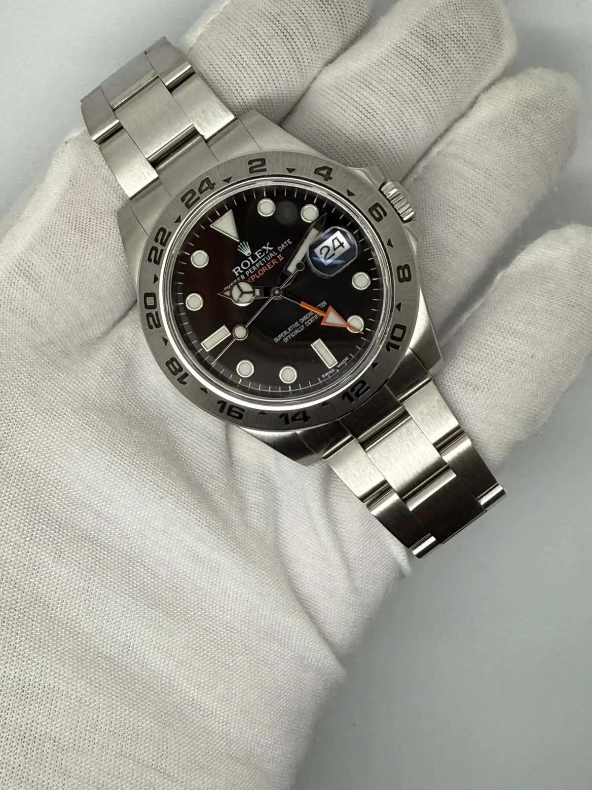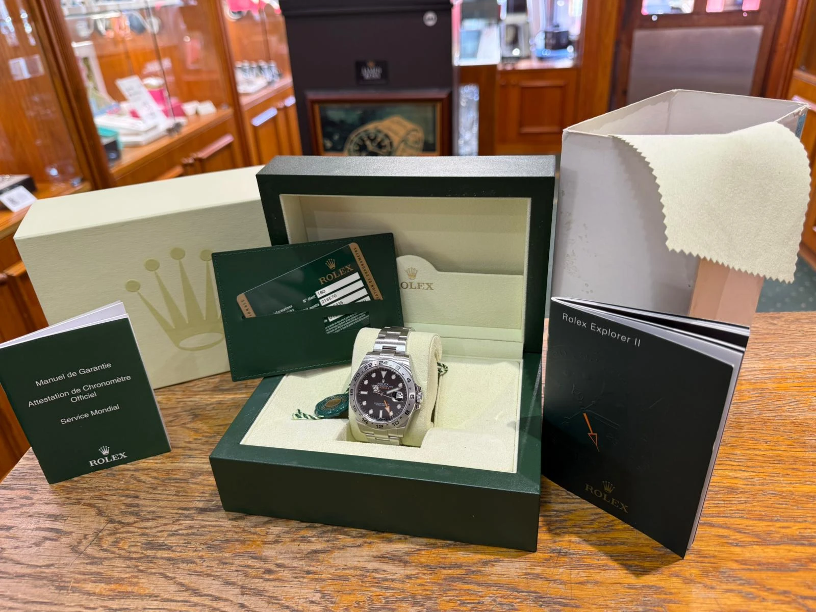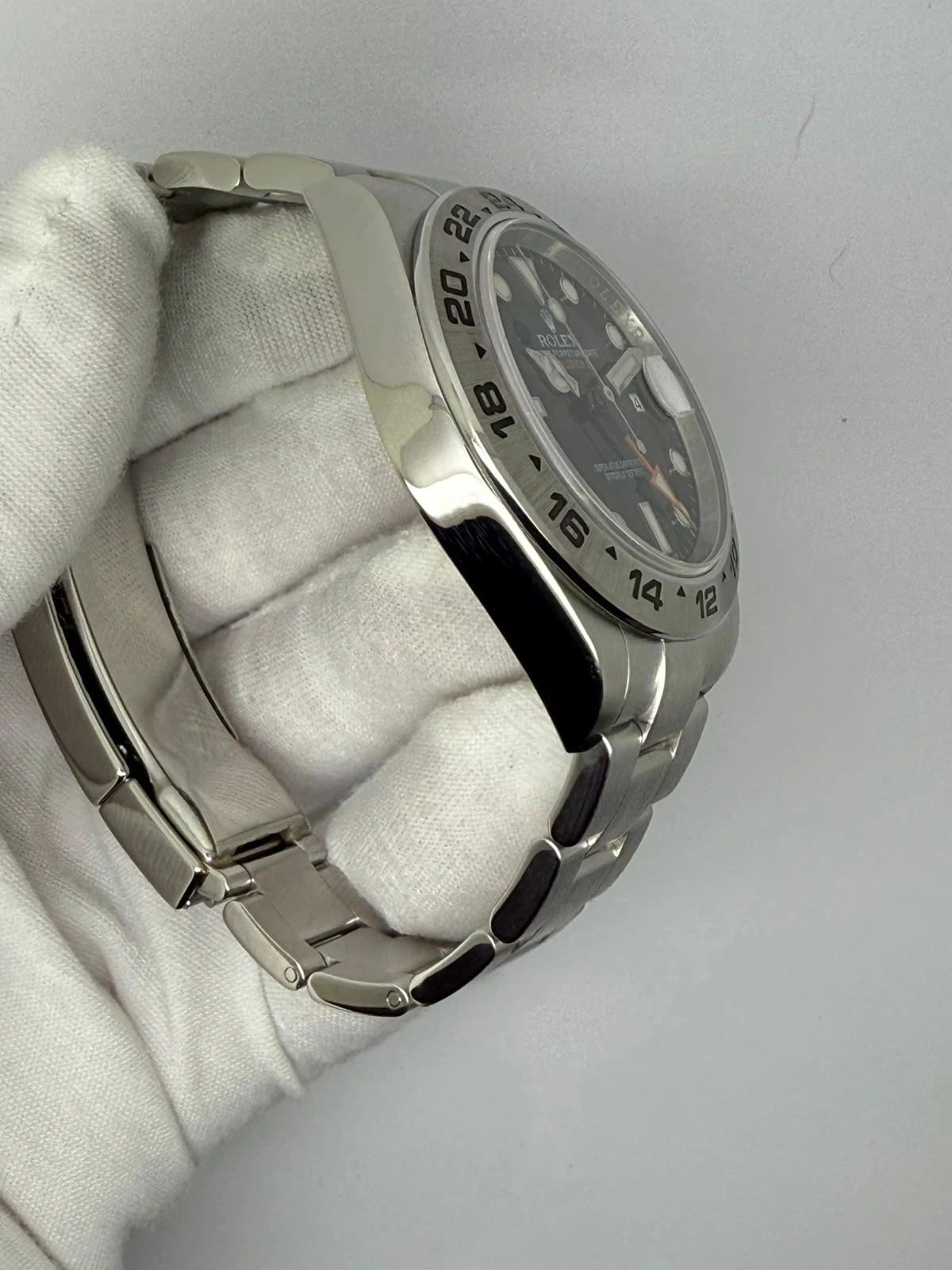 This outstanding Rolex Explorer II, reference 216570, combines rugged capability with refined precision. Crafted from 904L stainless steel, it features a robust 42mm case, a fixed 24-hour bezel, and the signature orange GMT hand, allowing for tracking of a second time zone a defining feature of this professional adventurer’s watch.