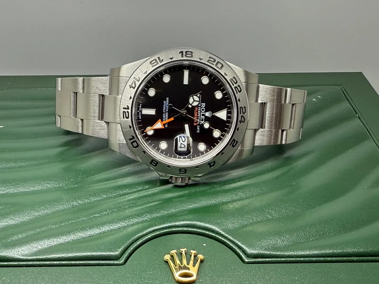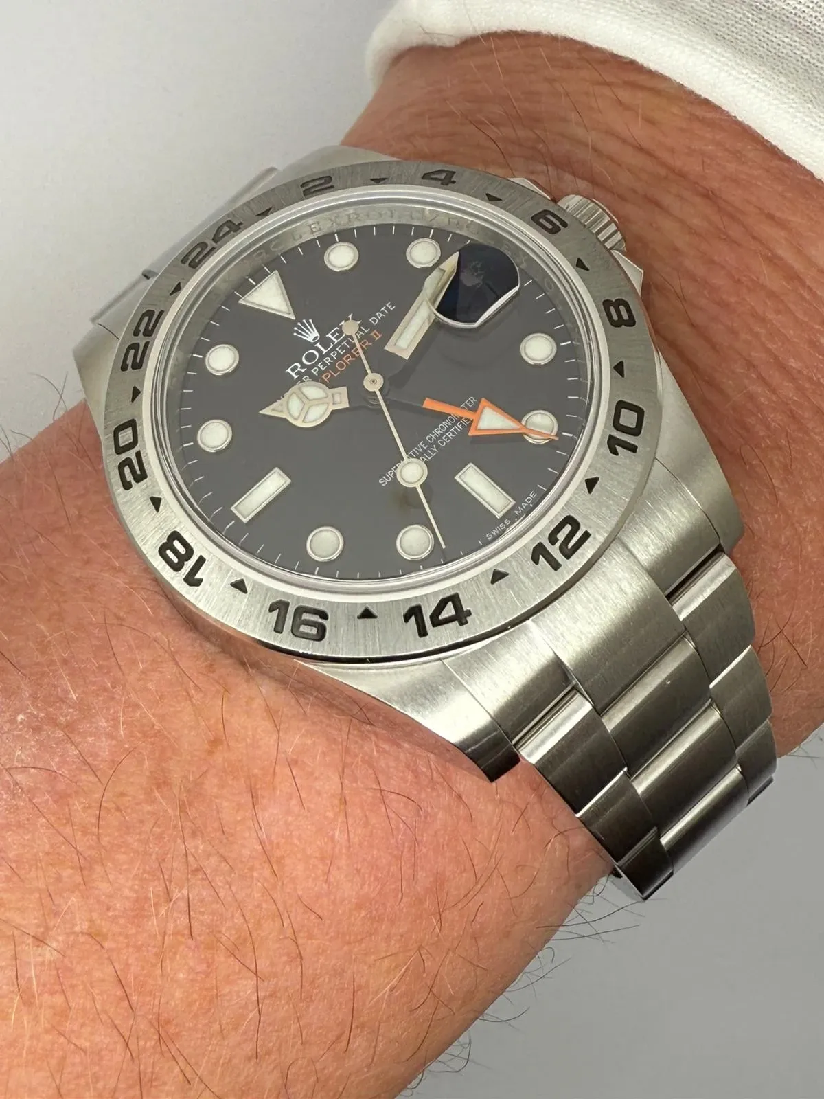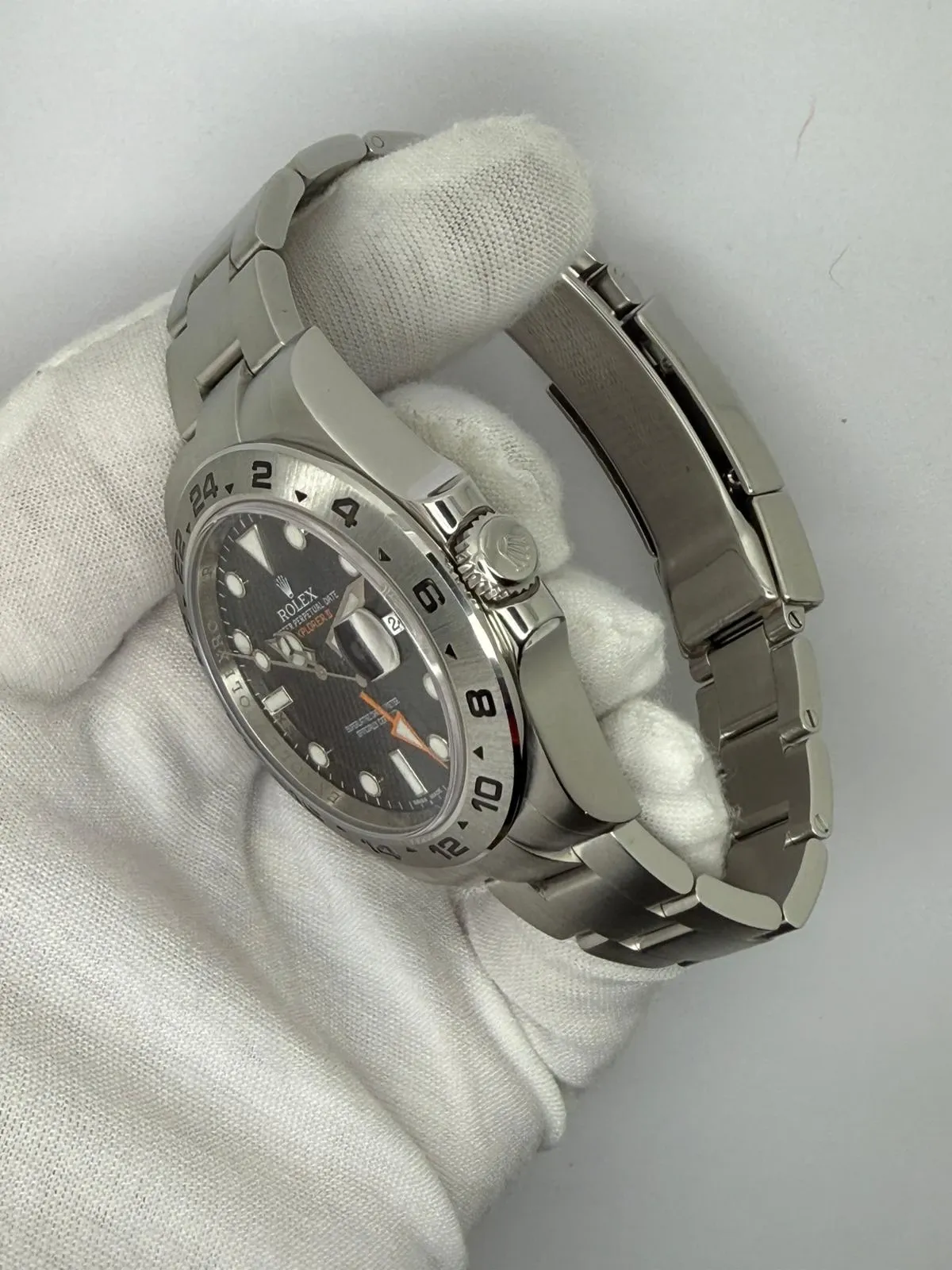 This outstanding Rolex Explorer II, reference 216570, combines rugged capability with refined precision. Crafted from 904L stainless steel, it features a robust 42mm case, a fixed 24-hour bezel, and the signature orange GMT hand, allowing for tracking of a second time zone a defining feature of this professional adventurer’s watch.