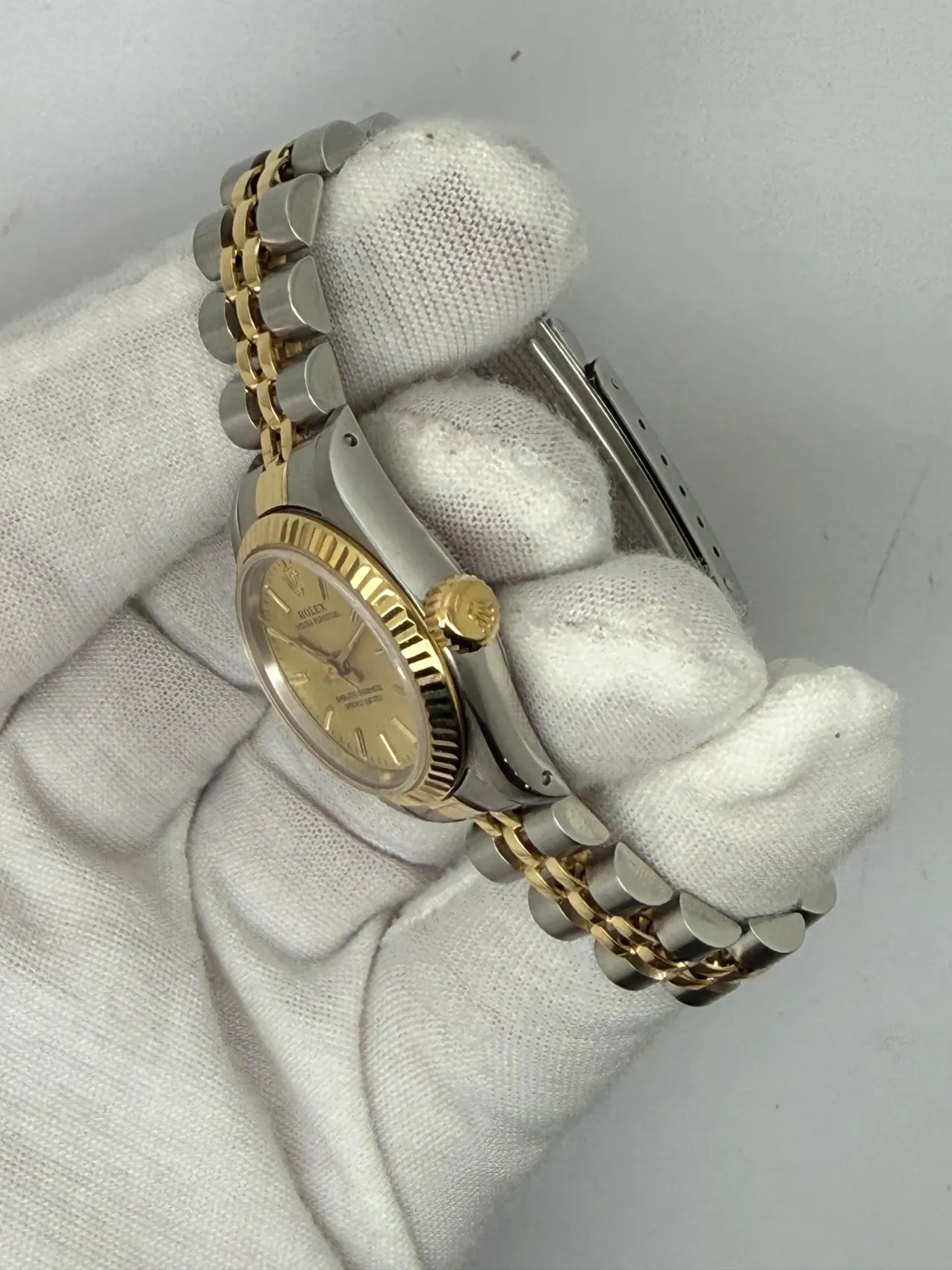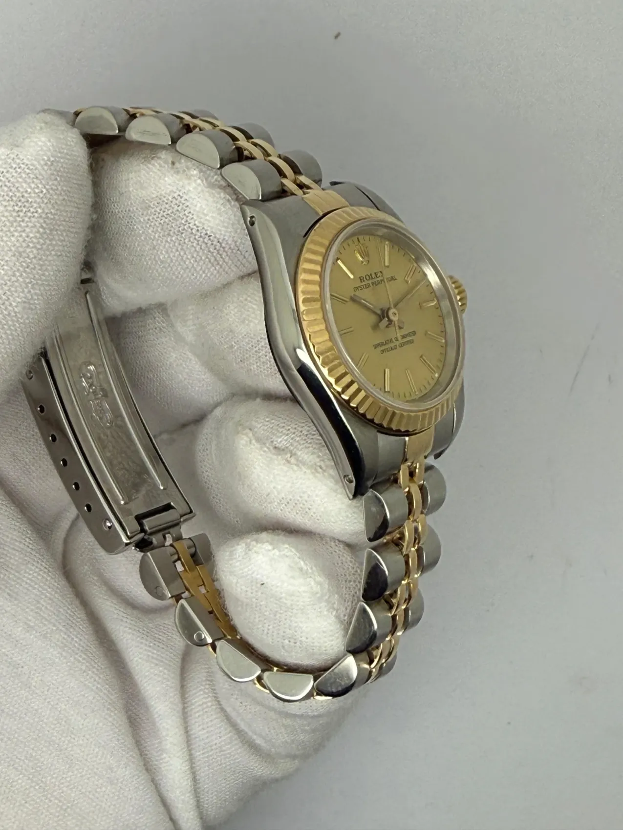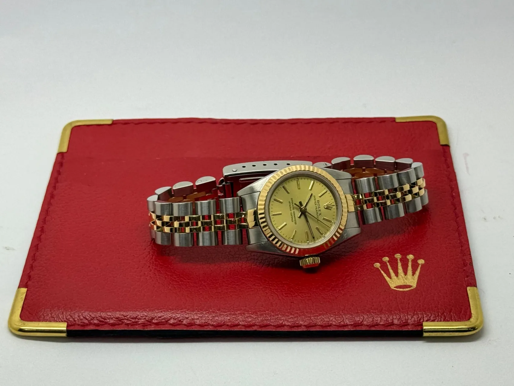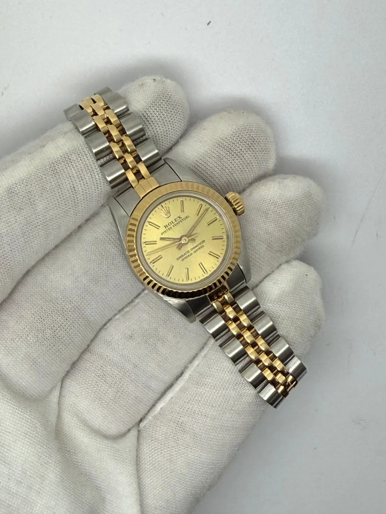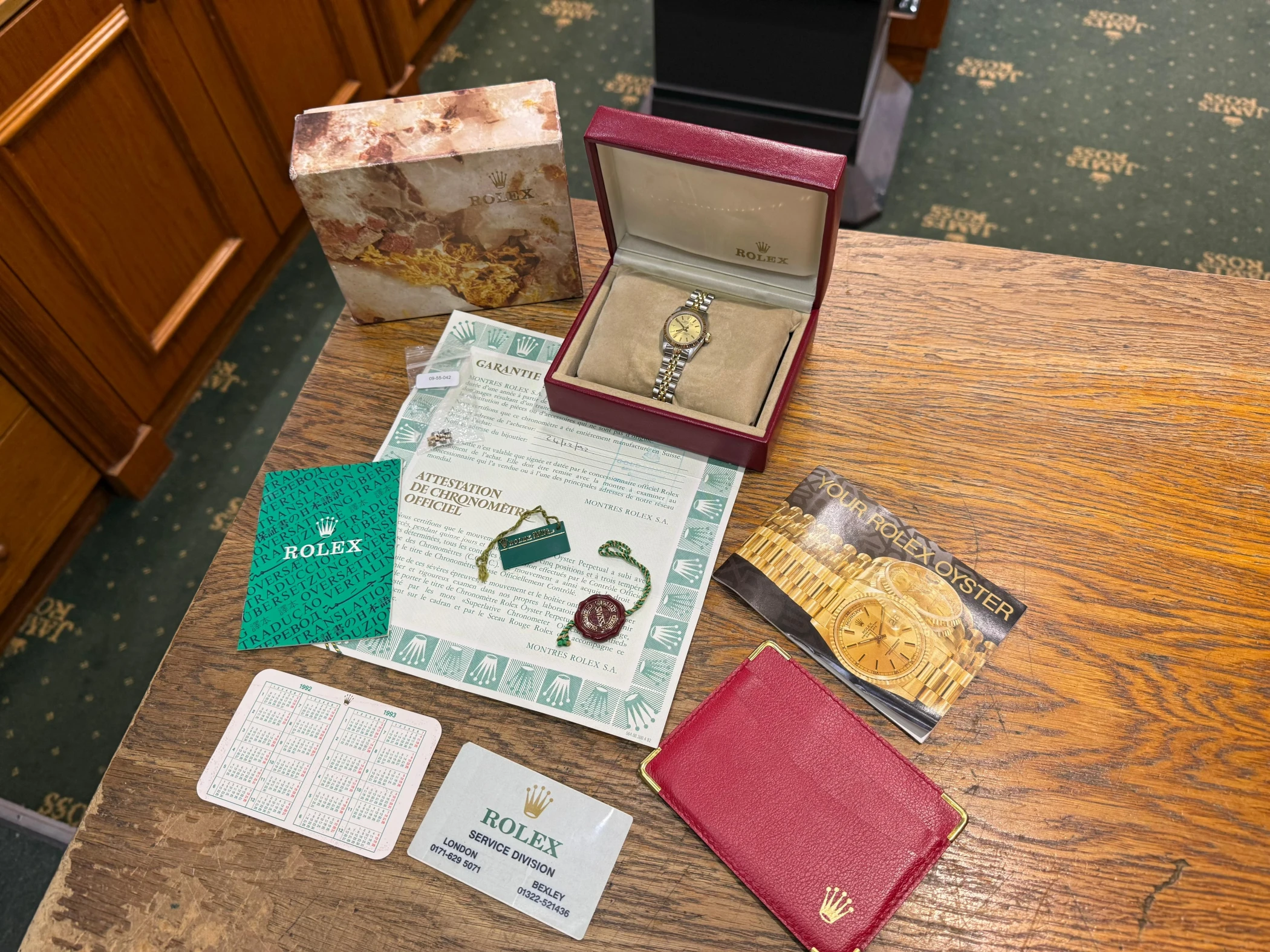 Presented in excellent condition, this example comes complete with its original box and papers, enhancing its appeal as a collectible set. A classic two-tone design, the Oyster Perpetual 67193 is a perfect choice for those seeking a luxury timepiece that blends understated style with Rolex’s renowned durability.