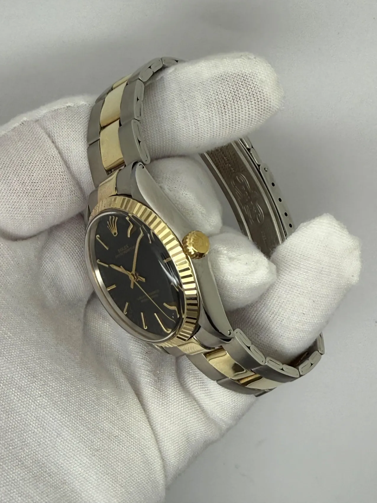 This 1969 Rolex Oyster Perpetual, reference 5500, is a rare and highly collectable vintage model. Measuring 34mm, the watch is crafted in a combination of stainless steel and gold, an unusual configuration that makes it particularly desirable. Its striking black dial offers strong contrast and a touch of elegance, setting it apart from more traditional designs of the era.