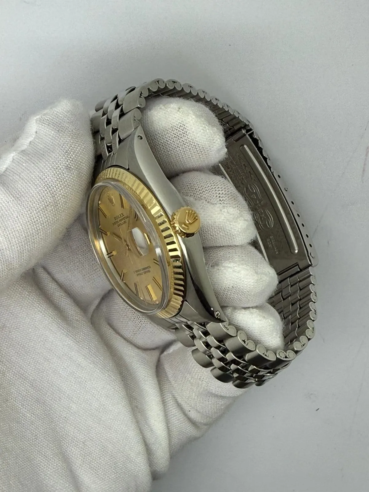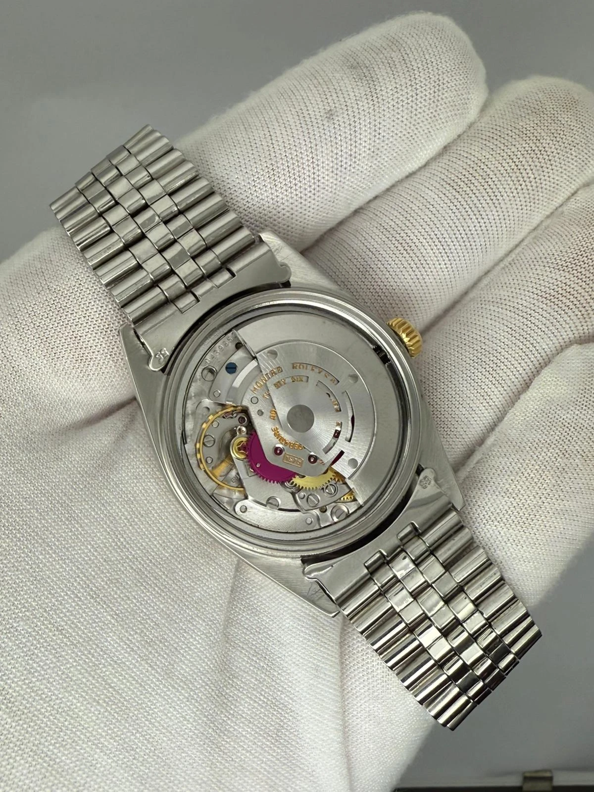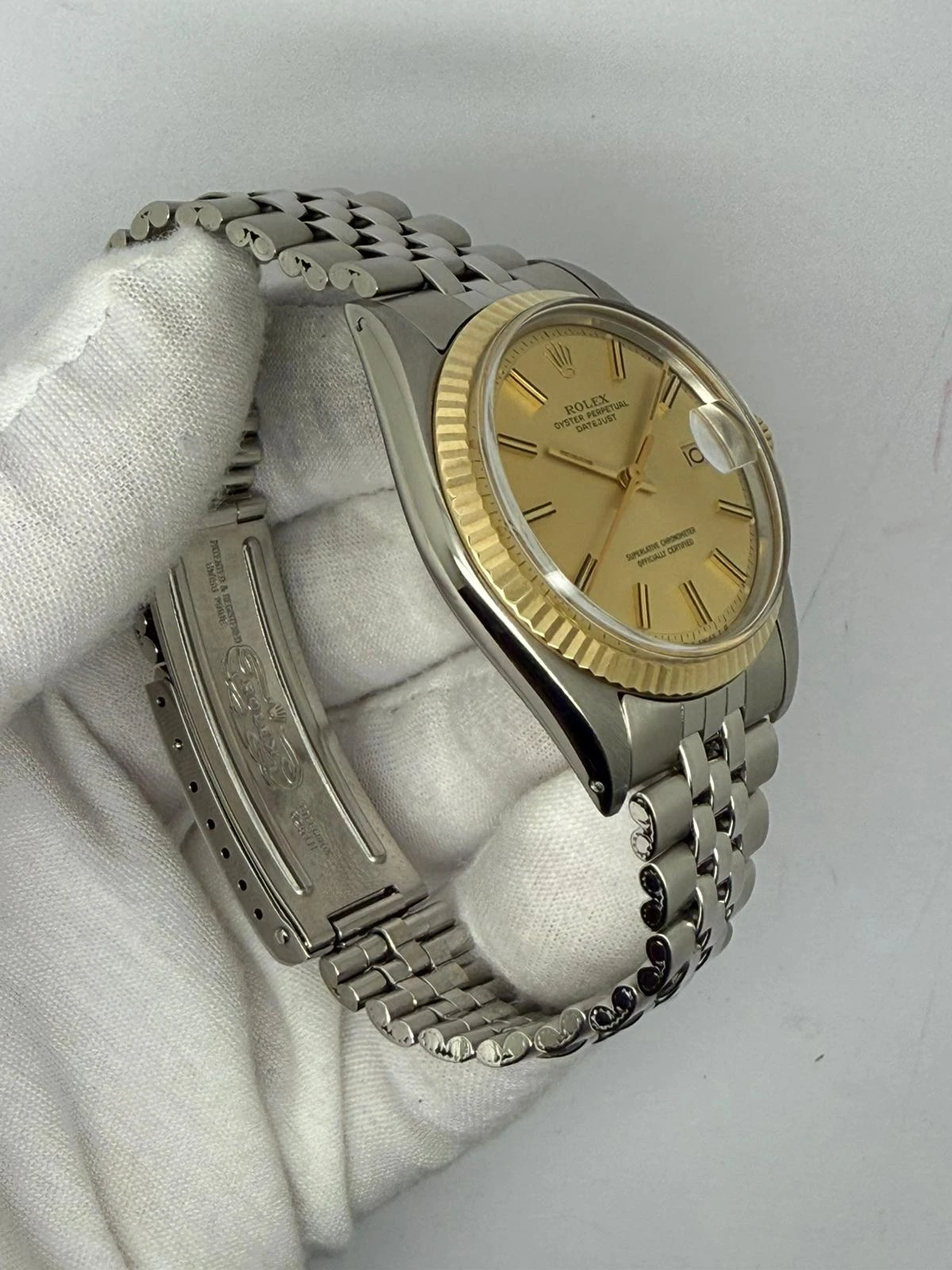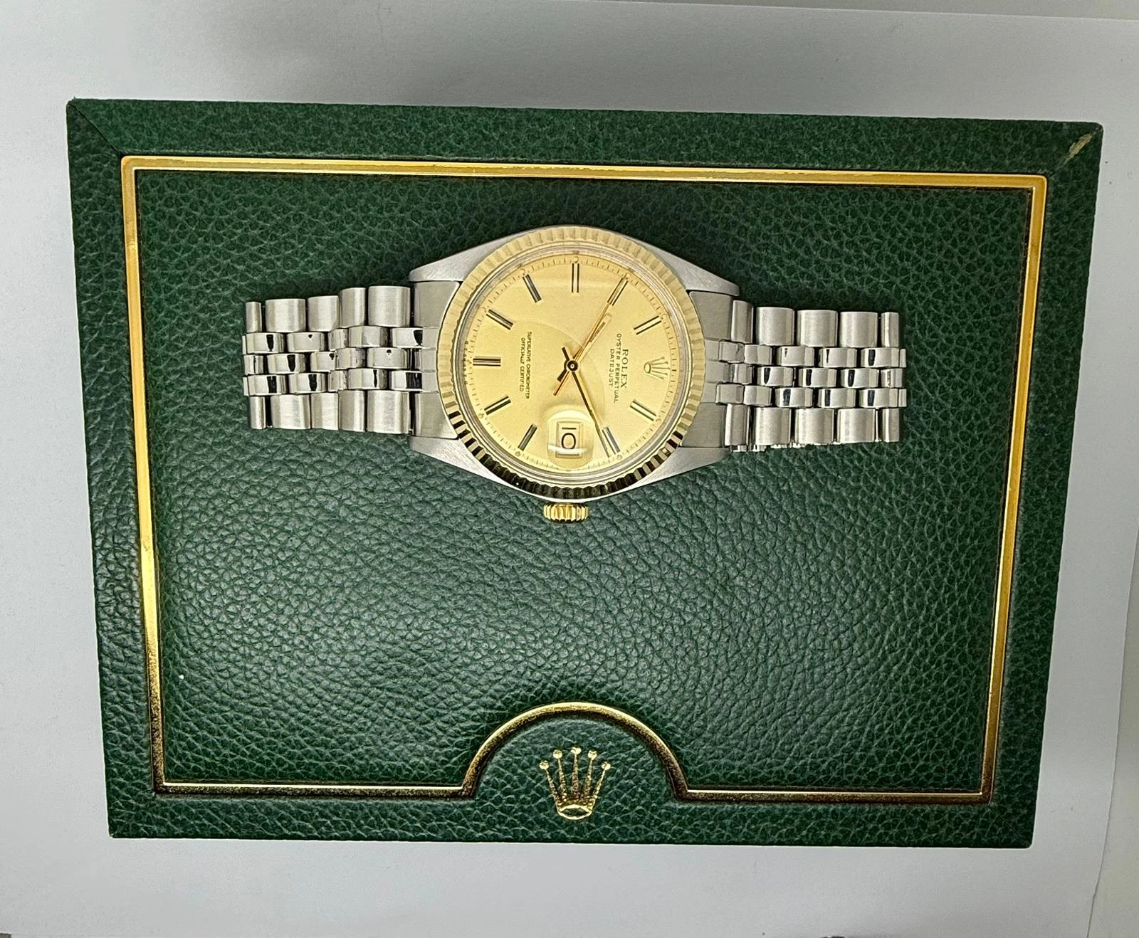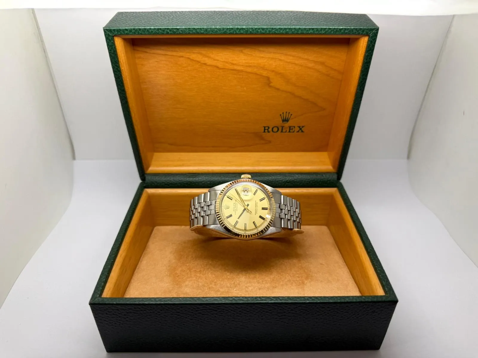 This 1973 Rolex Oyster Perpetual Datejust, reference 1601, is a classic vintage model combining stainless steel with 18ct yellow gold. The 36mm case is fitted with the iconic fluted bezel, while the champagne ‘Sigma’ dial — distinguished by its subtle sigma symbols flanking the “Swiss” text — adds both rarity and vintage charm. Fitted to the original Rolex Jubilee bracelet, the watch offers the timeless Datejust look that has become a cornerstone of Rolex design.