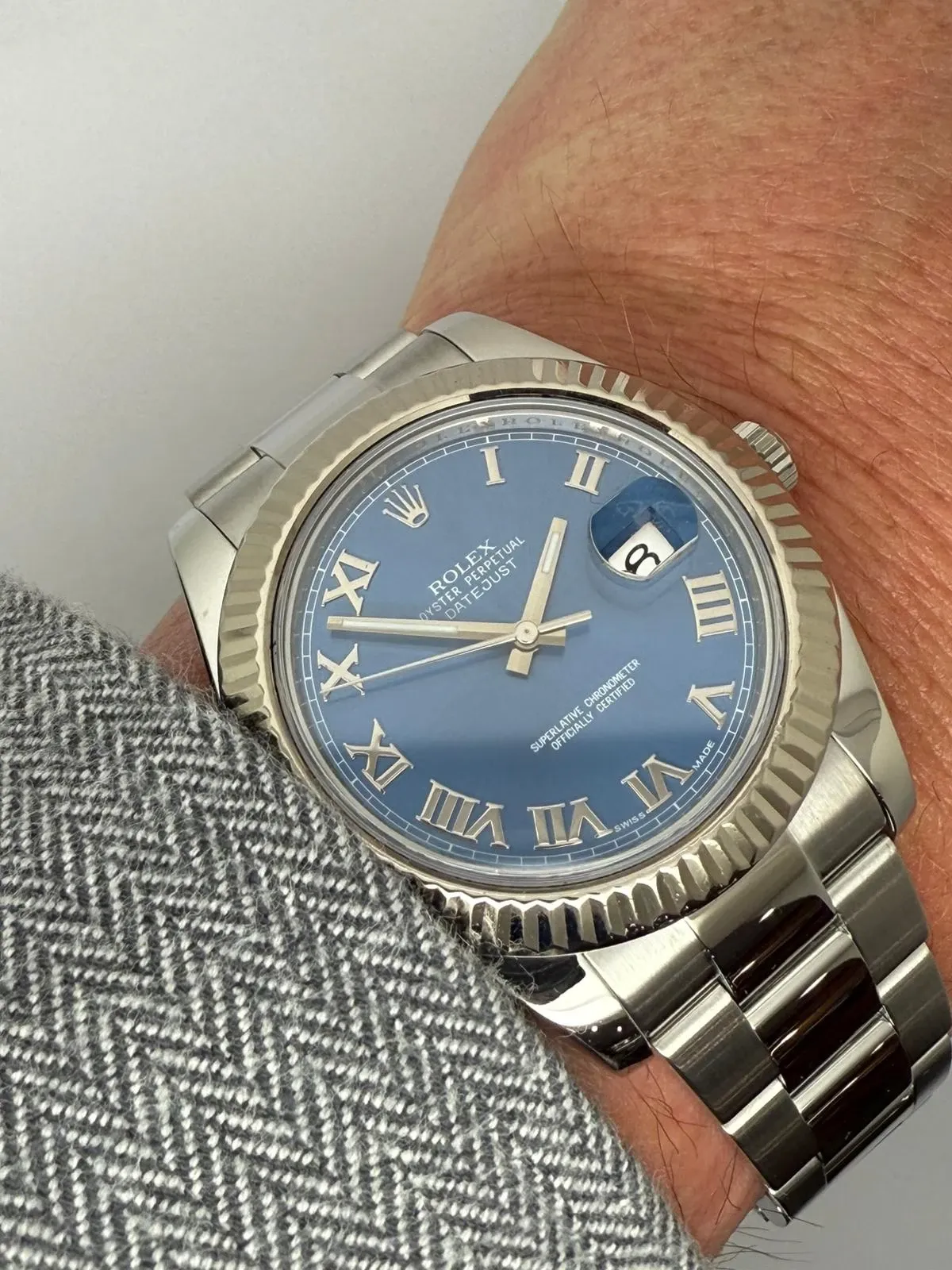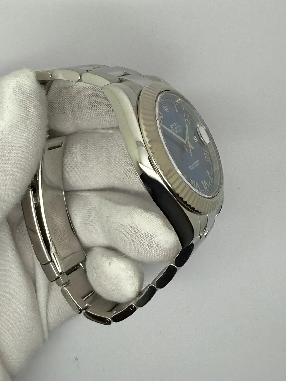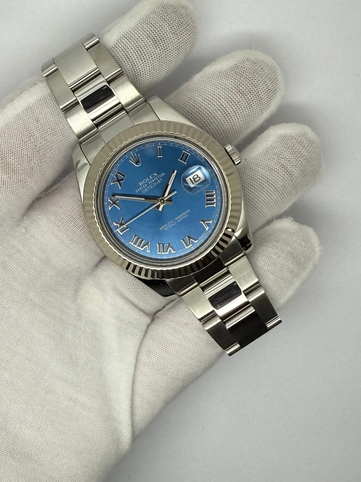This exceptional Rolex Oyster Perpetual Datejust 41, reference 116334, features the stunning and highly sought-after Azzurro Blue dial, a distinctive shade that beautifully complements the classic fluted 18ct white gold bezel. Crafted from stainless steel, the 41mm case combines elegant design with everyday durability, fitted to a solid Oyster bracelet for a refined yet robust finish.