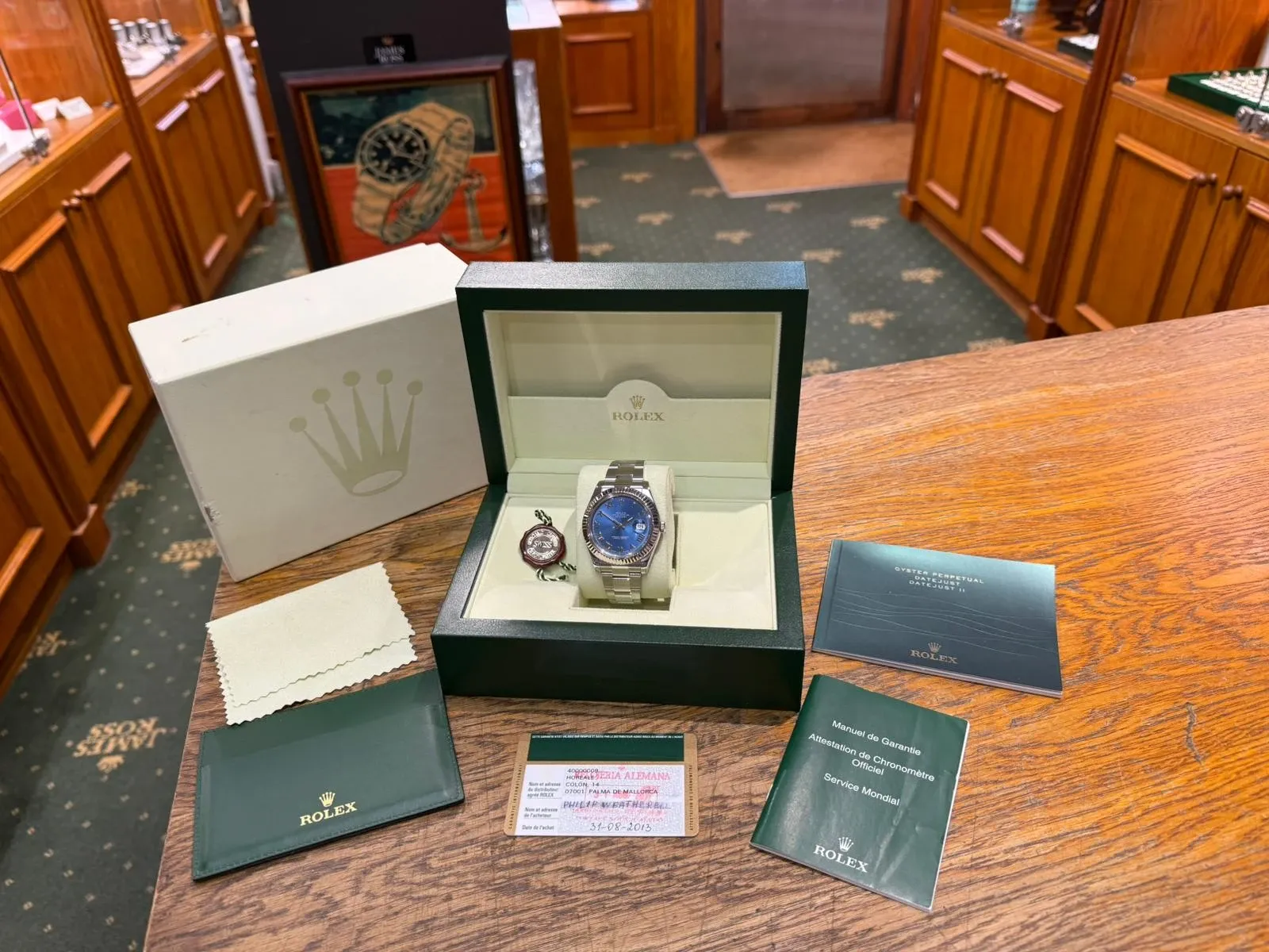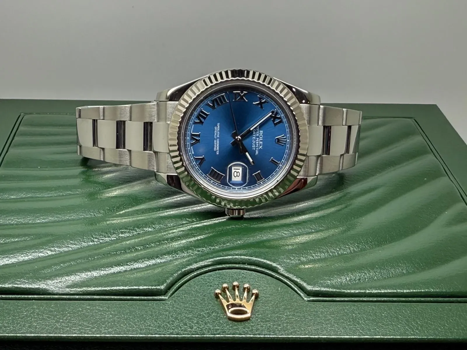 Presented in immaculate condition, this watch comes as a complete collector’s set with its original Rolex box and papers. Fully serviced and accompanied by a two-year guarantee, it stands as an exceptional example of one of Rolex’s most desirable contemporary Datejust references.