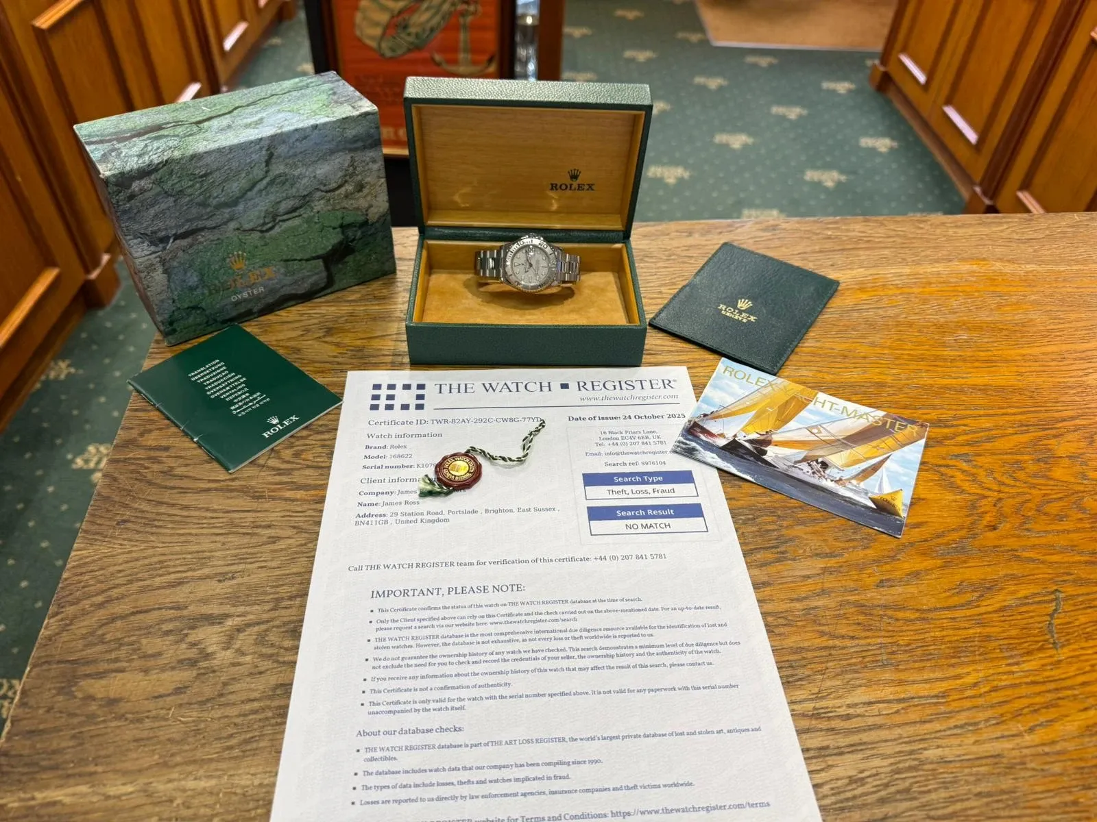 Presented in immaculate condition, this timepiece comes complete with its original box, booklets, hang tag, certificate of authenticity, and a Watch Register certificate. Fully serviced and accompanied by a two-year guarantee, this Yacht-Master is a superb example for collectors and enthusiasts alike.